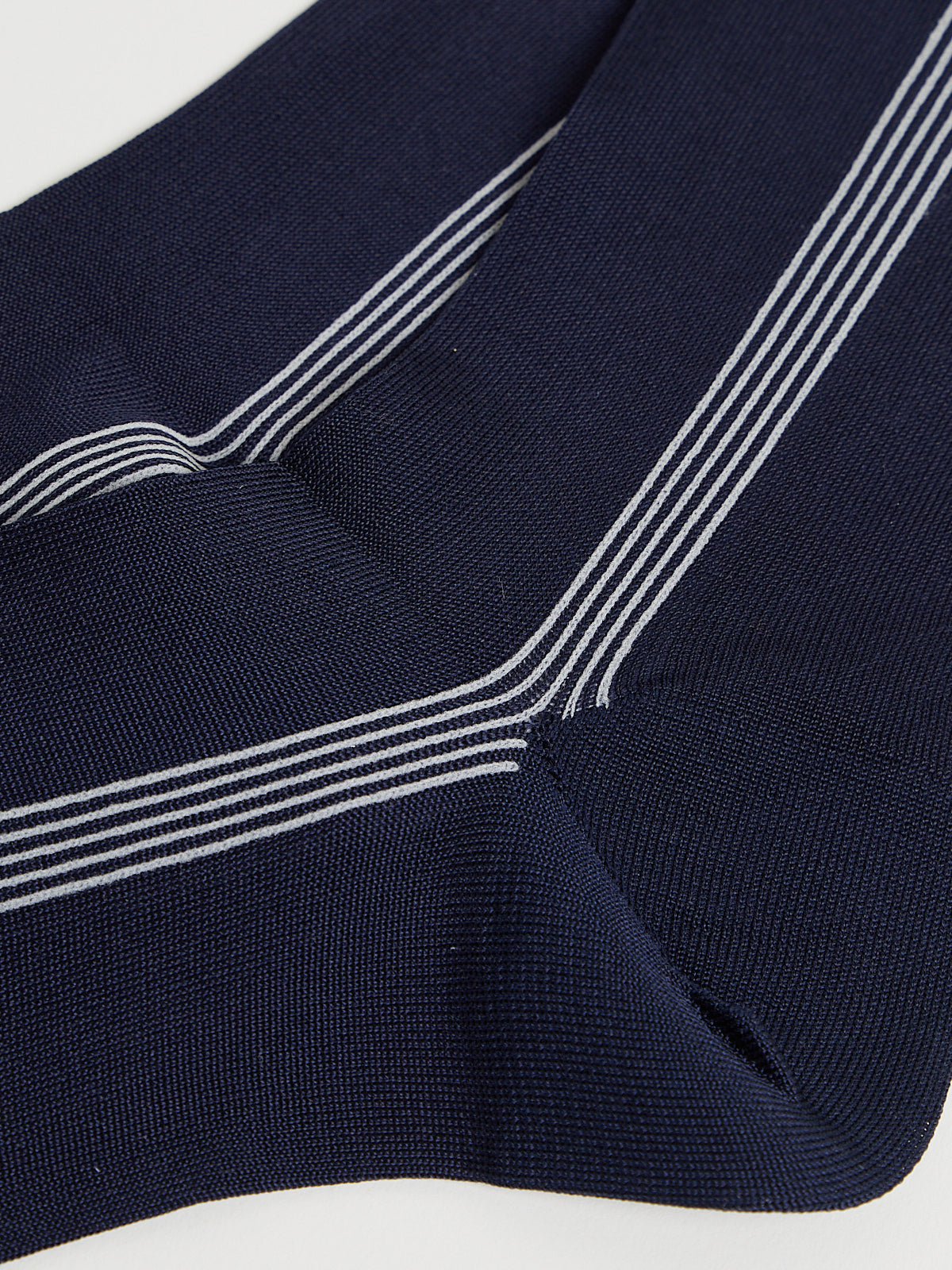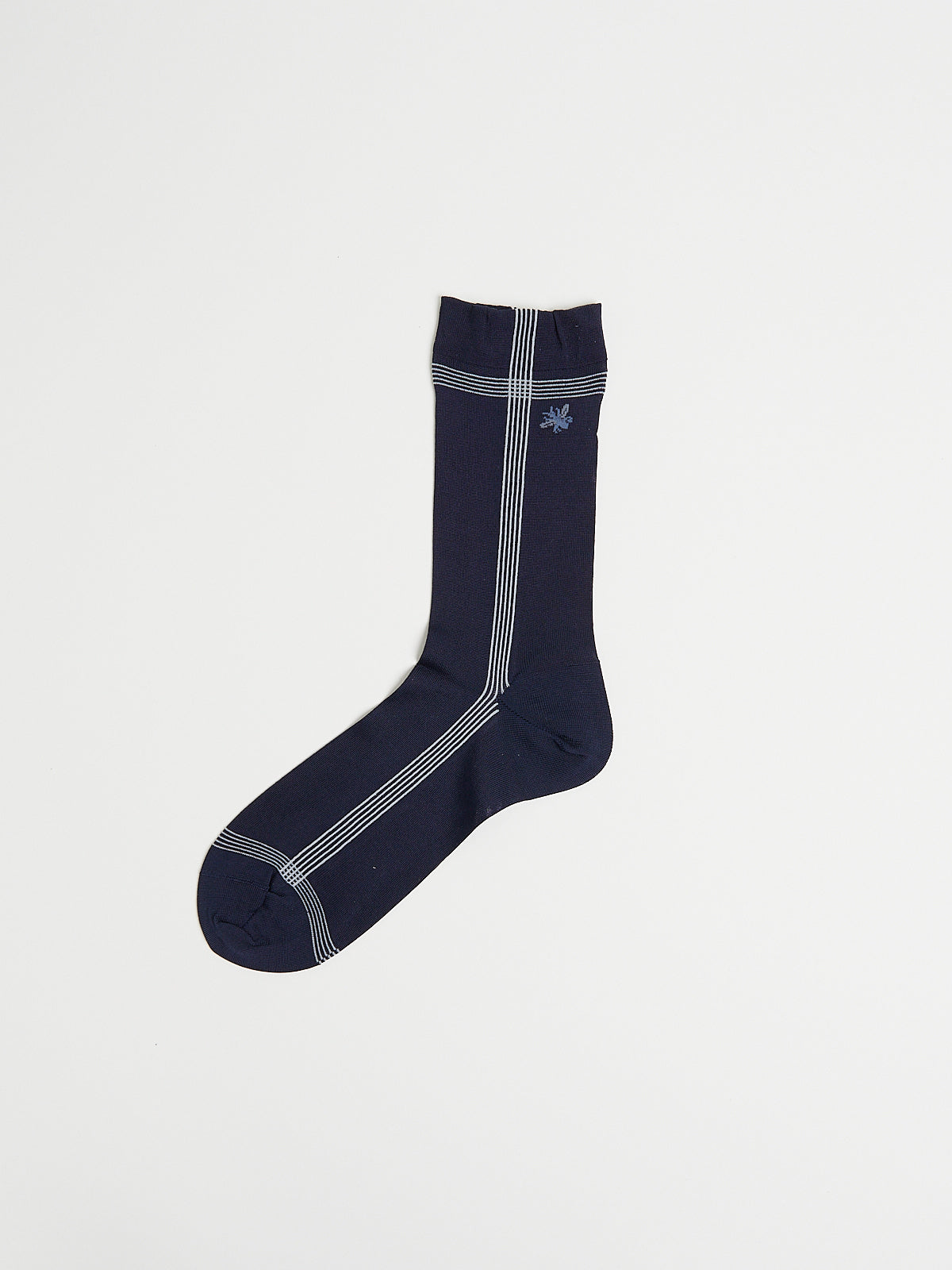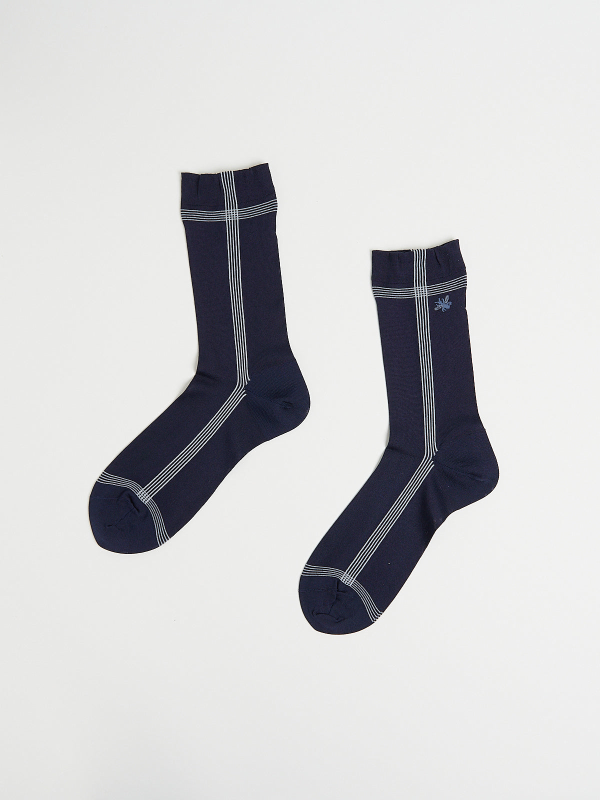 Crew socks in a navy silk blend with a slight sheen. Features a stripe design and Antipast's signature bee motif on the leg.