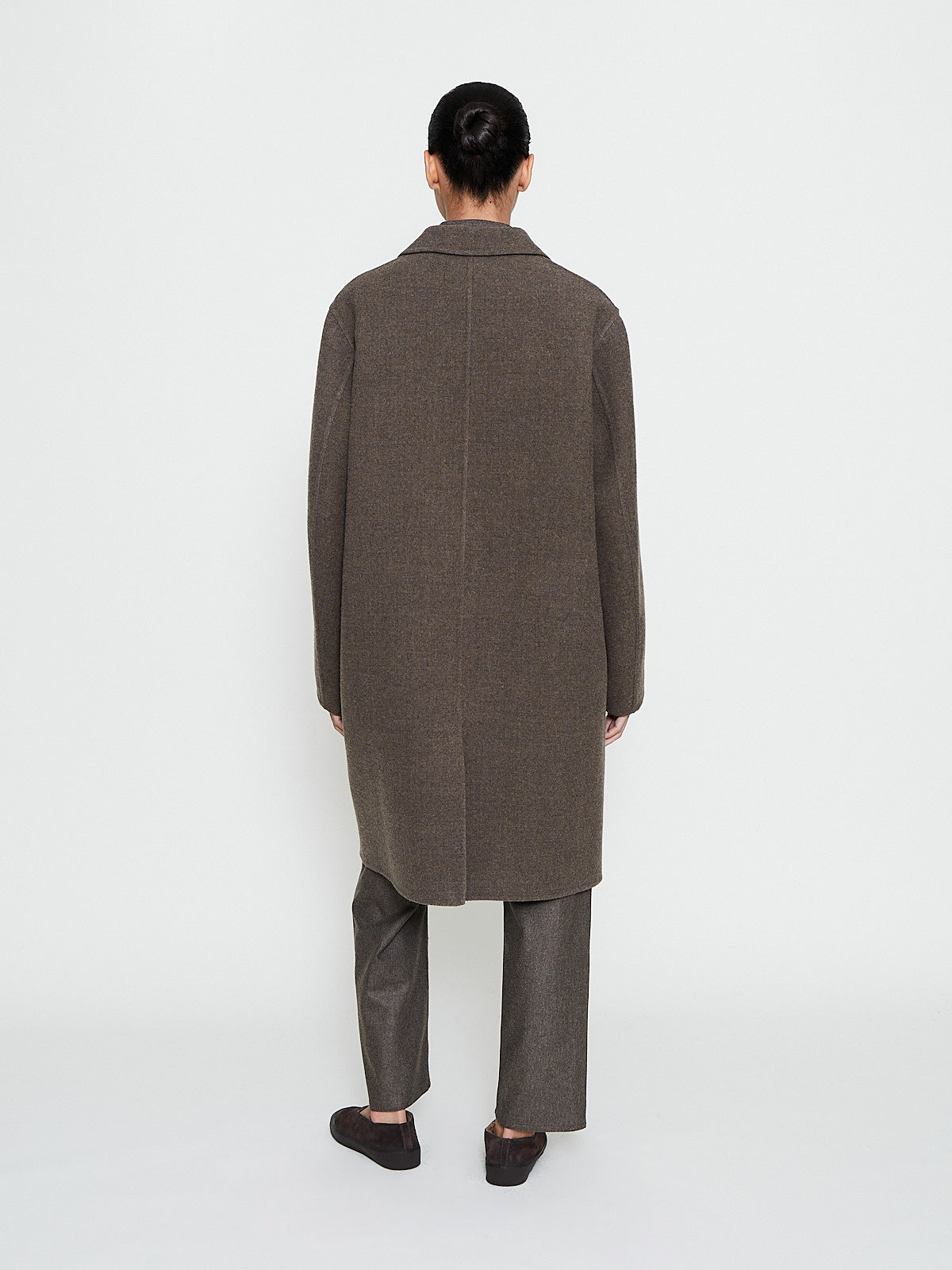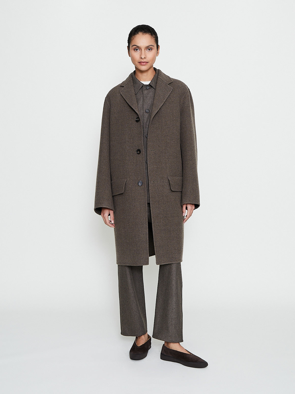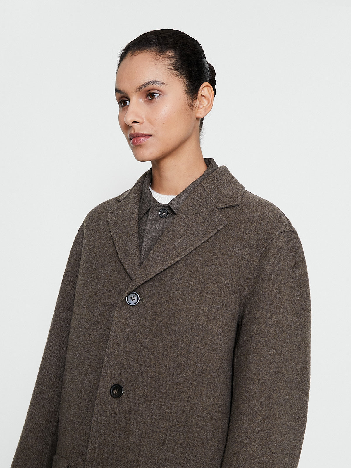 Oversized coat in a taupe double-faced boiled wool melange blend. Notched collar, front button fastening and long sleeves with a dropped shoulder. Flap pockets on the front and a back vent. Knee-length.