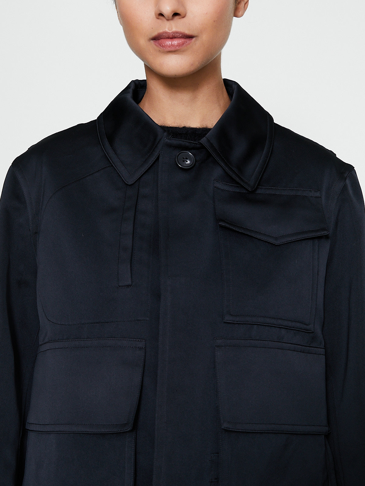 Oversized jacket in black polyester satin. Spread collar with a throat latch, concealed front button fastening and long sleeves. Large flap pockets on the front and a single chest pocket with a flap. Boxy fit.
