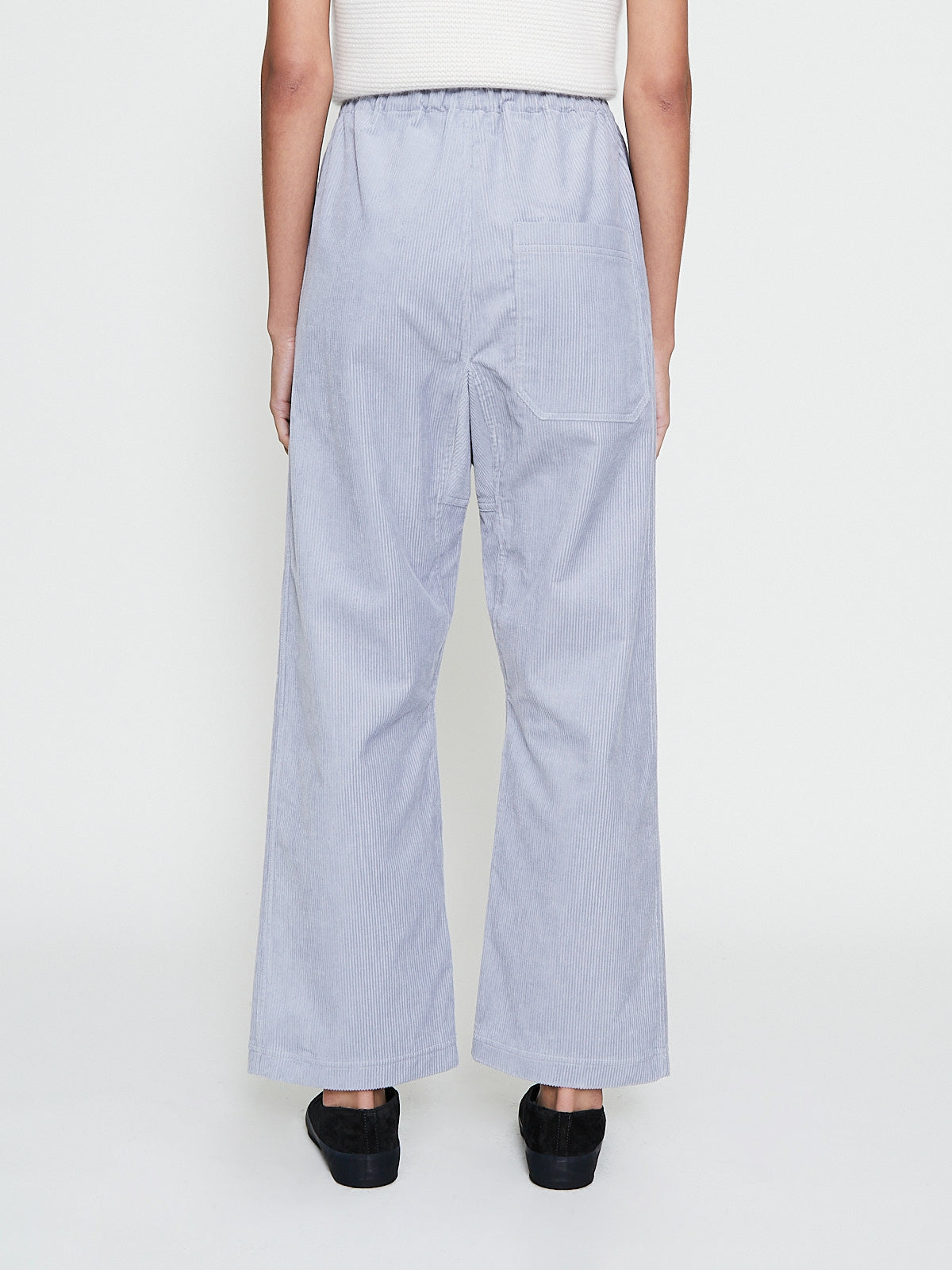 Relaxed pants in light grey cotton corduroy. Pull-on style and an elasticated waistband and a button fly. Features a low crotch with a gusset detail. Side seam pockets and a single patch pocket on the back.