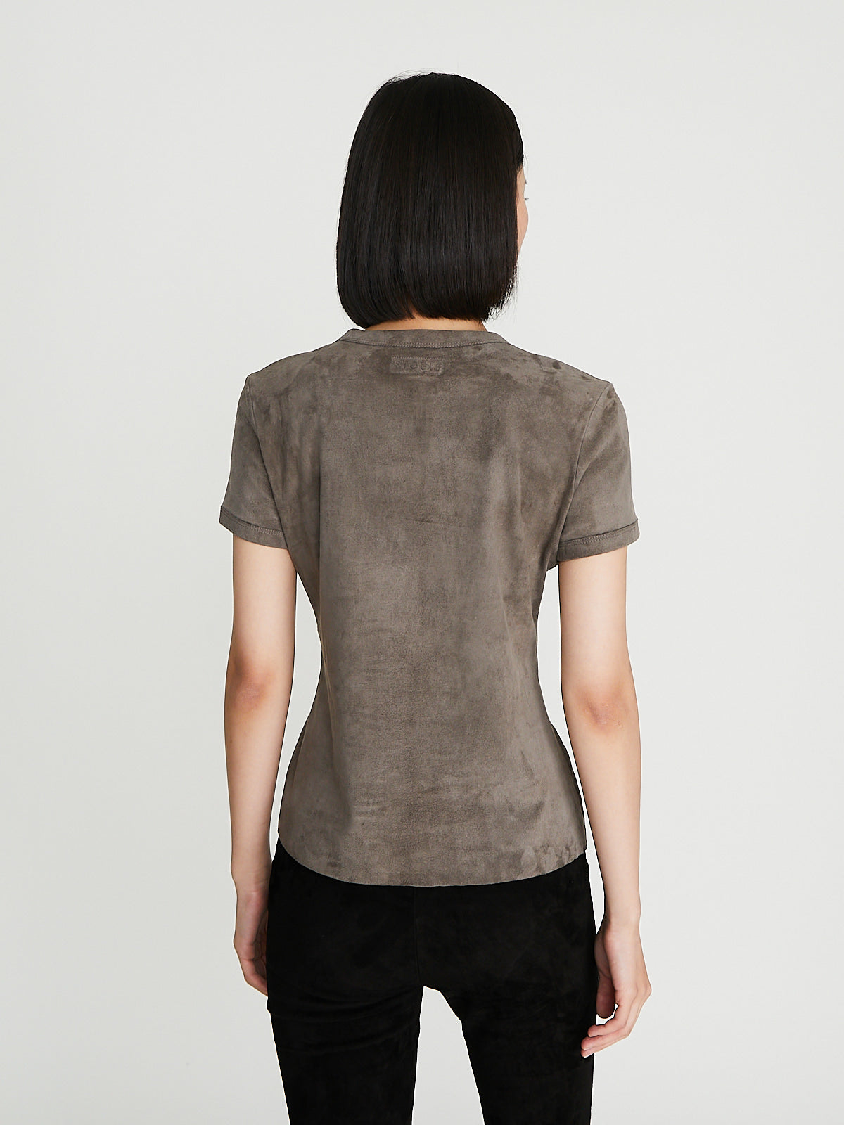 Fitted t-shirt in taupe machine-washable light suede lambskin. Round neckline. Fully lined.