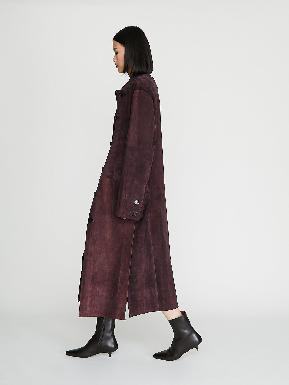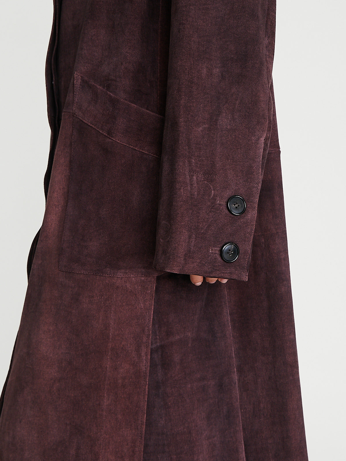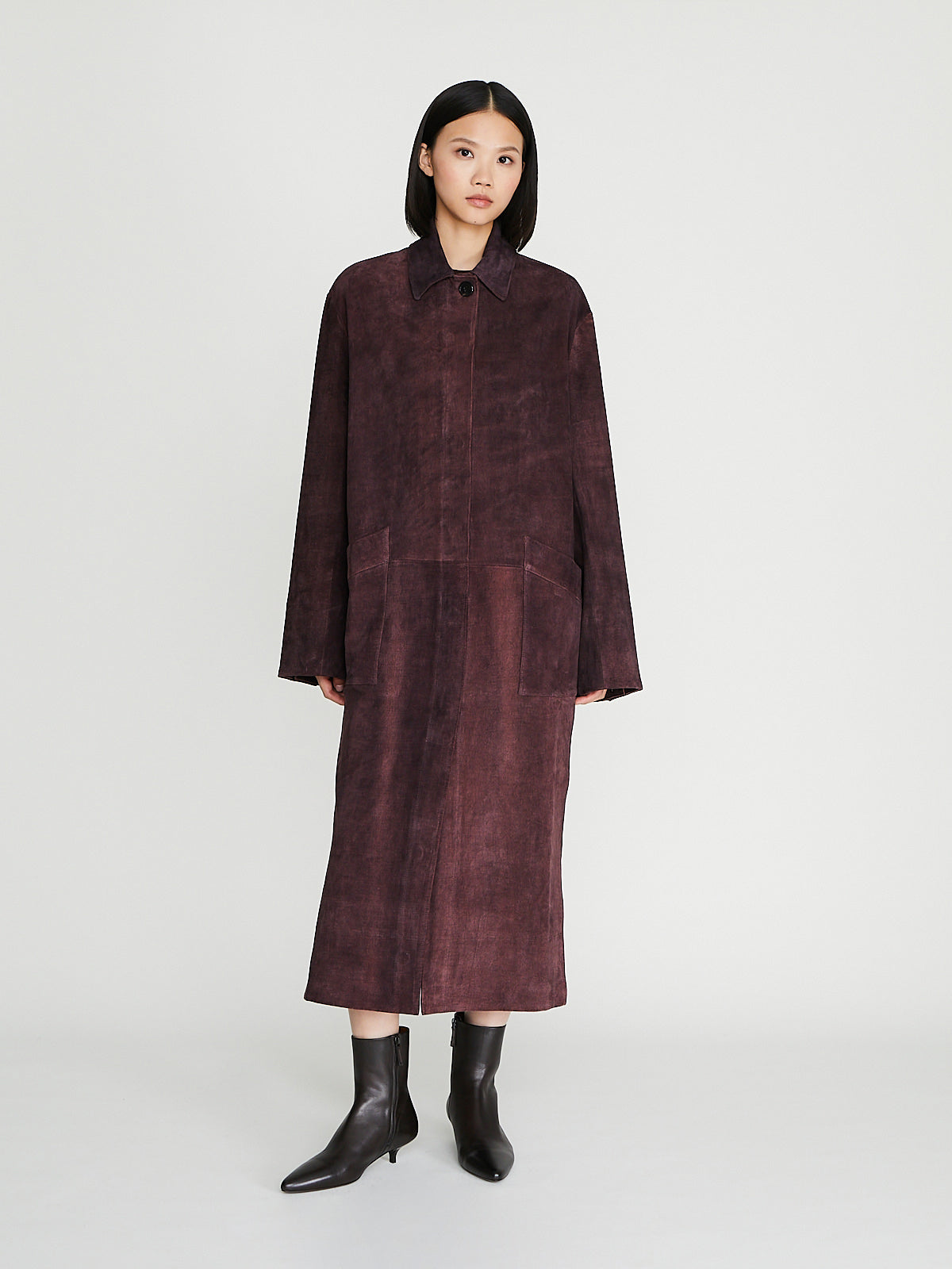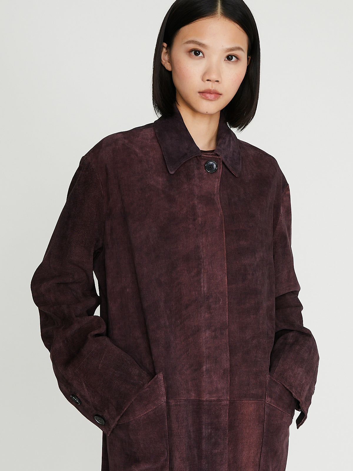 Oversized trench coat in stretchy burgundy machine-washable suede lamb leather. Spread collar, concealed front button fastening and long sleeves with a dropped shoulder. Patch pockets on the front and two side slits. Cuts below-the-knee.