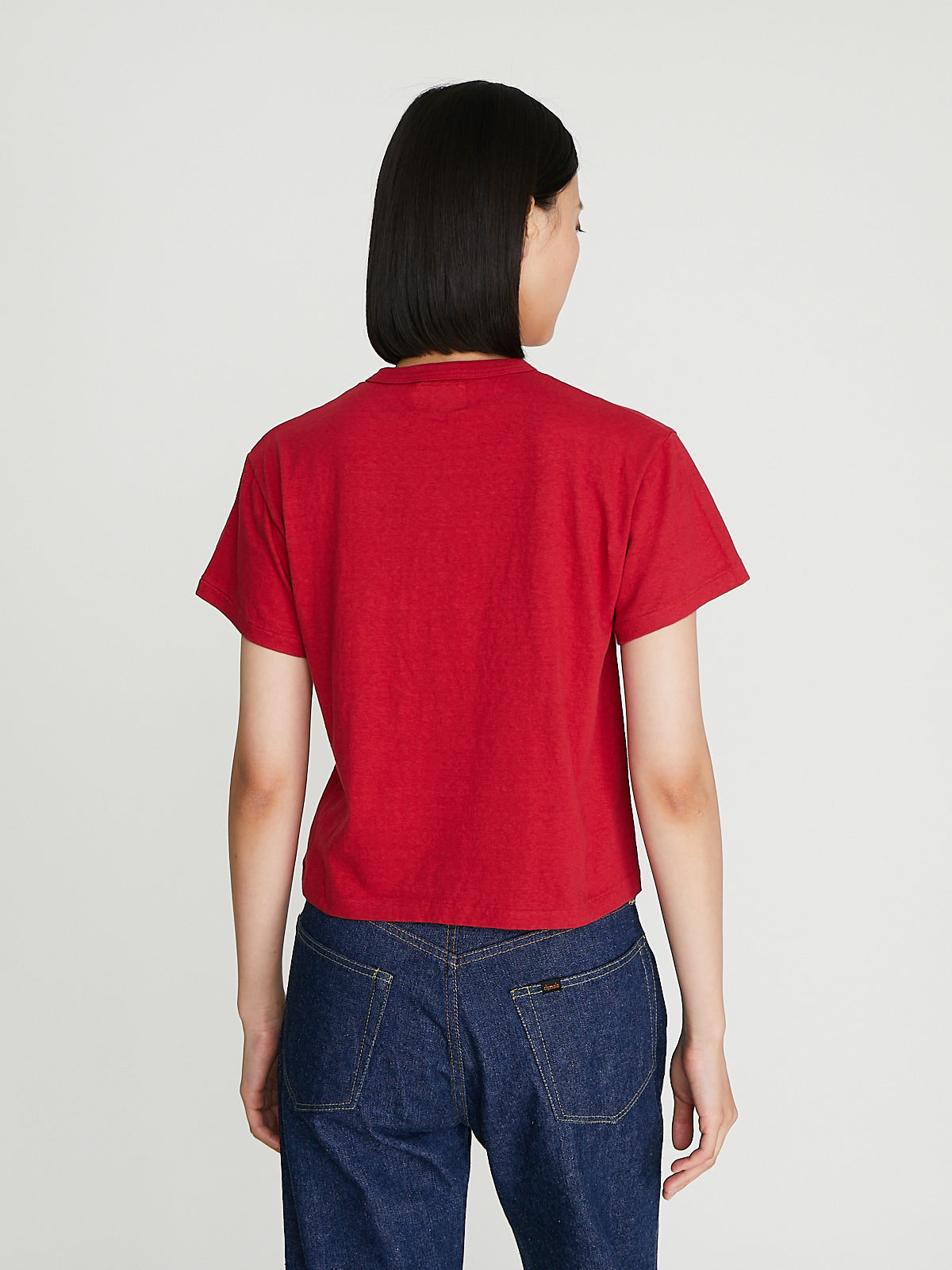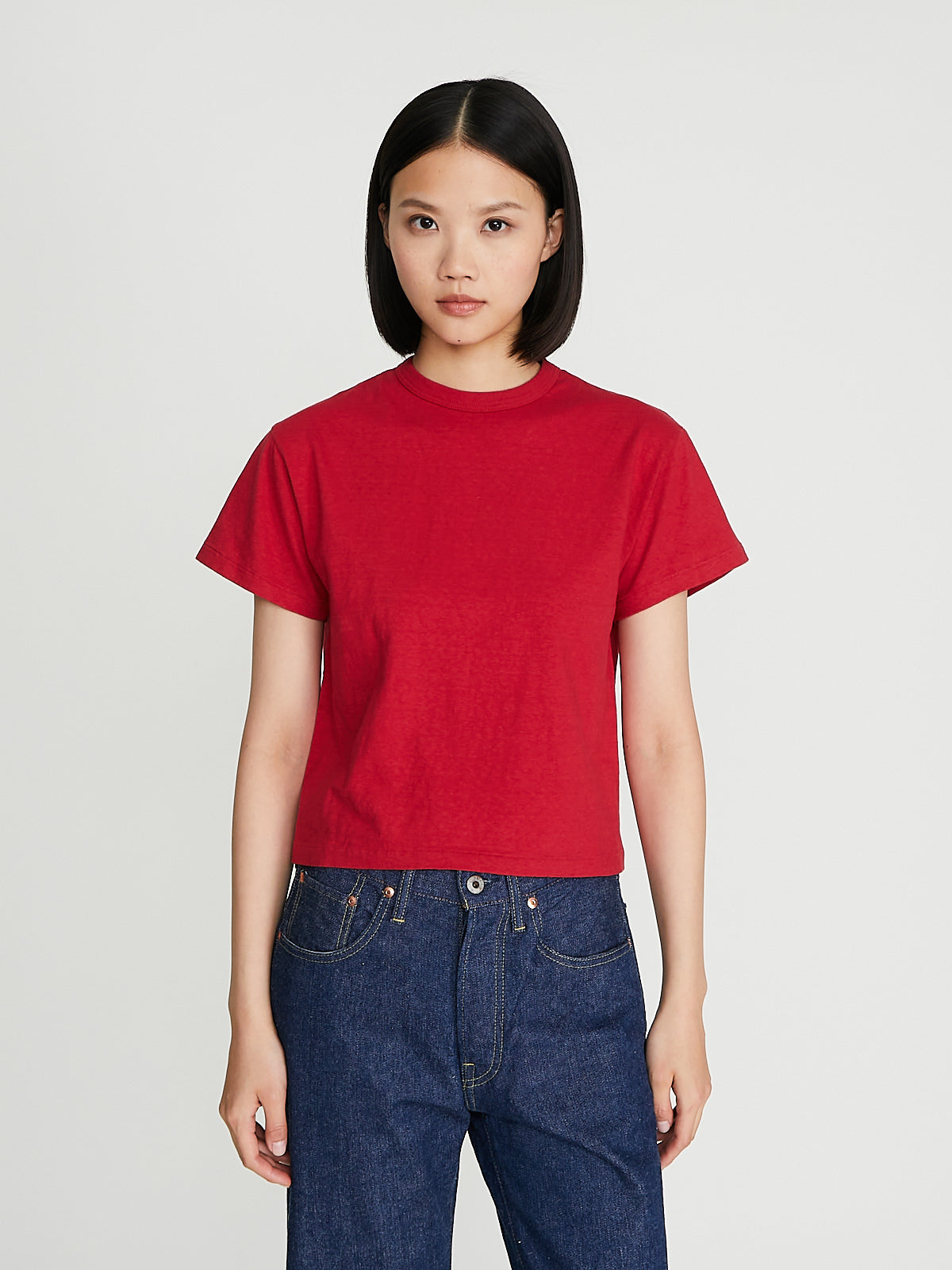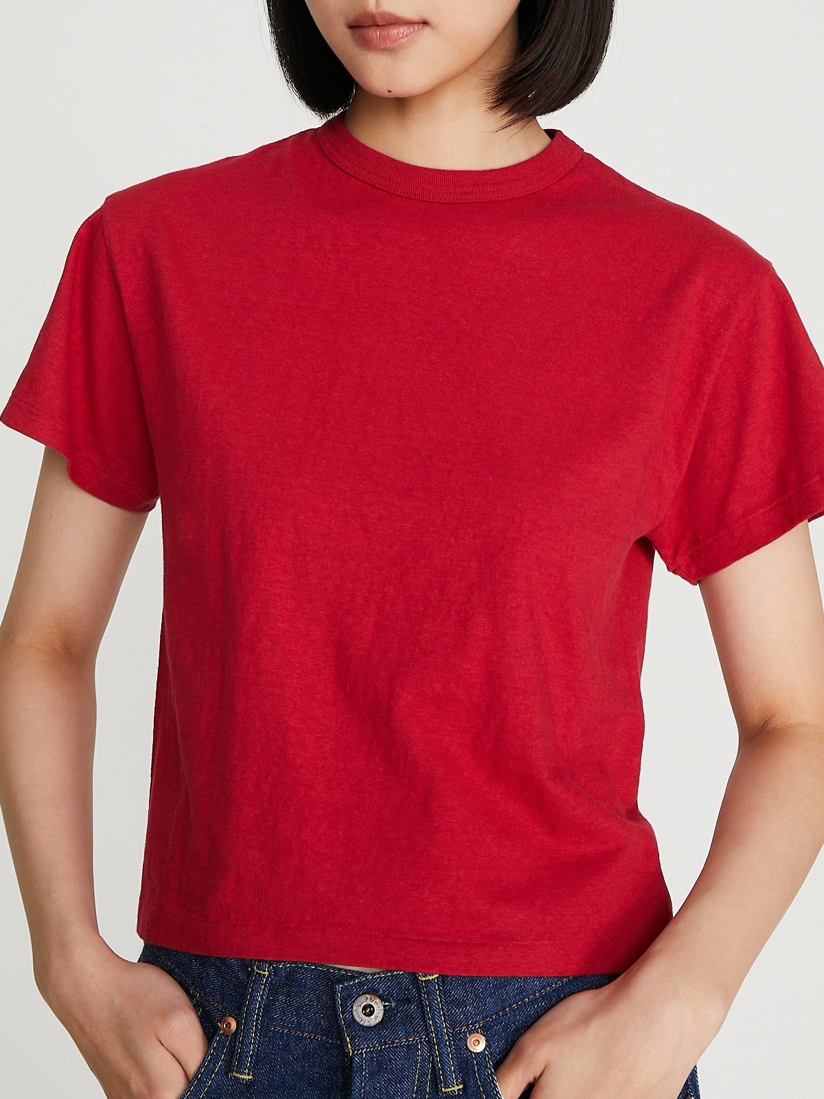Boxy t-shirt in recycled red Ochiwata (260gms) cotton. Round reinforced neckline and short sleeves. Constructed using antique loopwheel machines for a low tension, tubular knit without side seams.