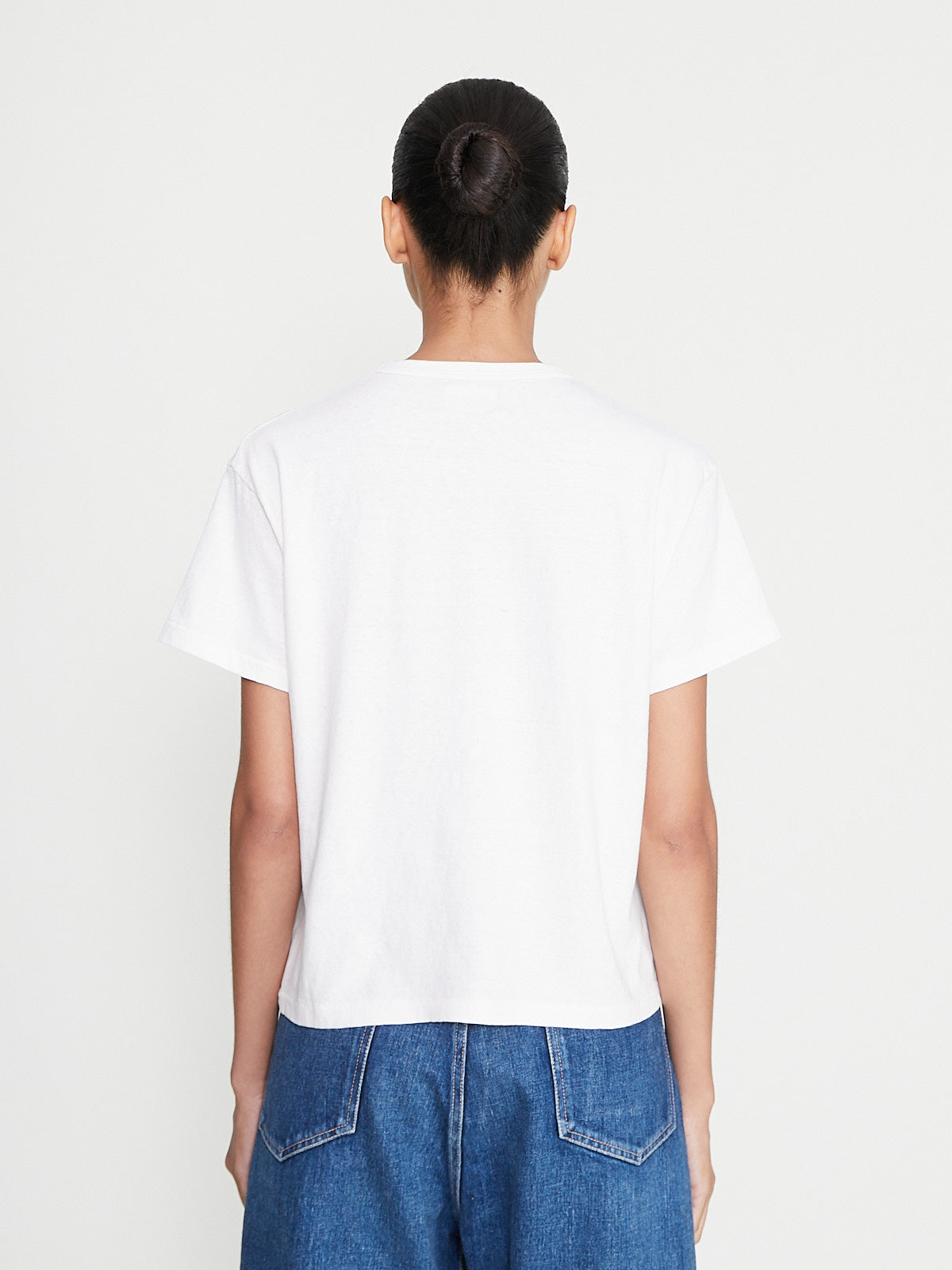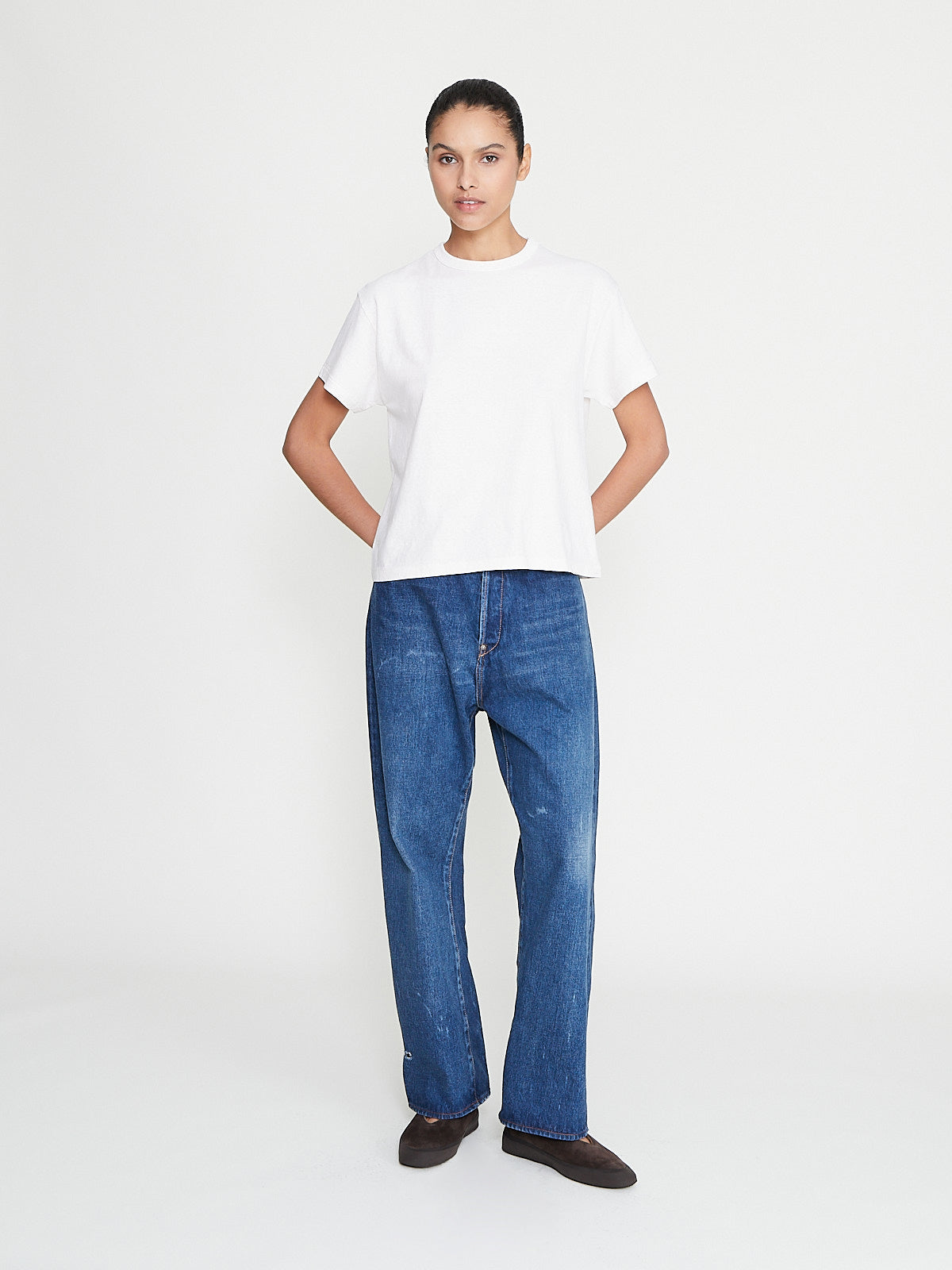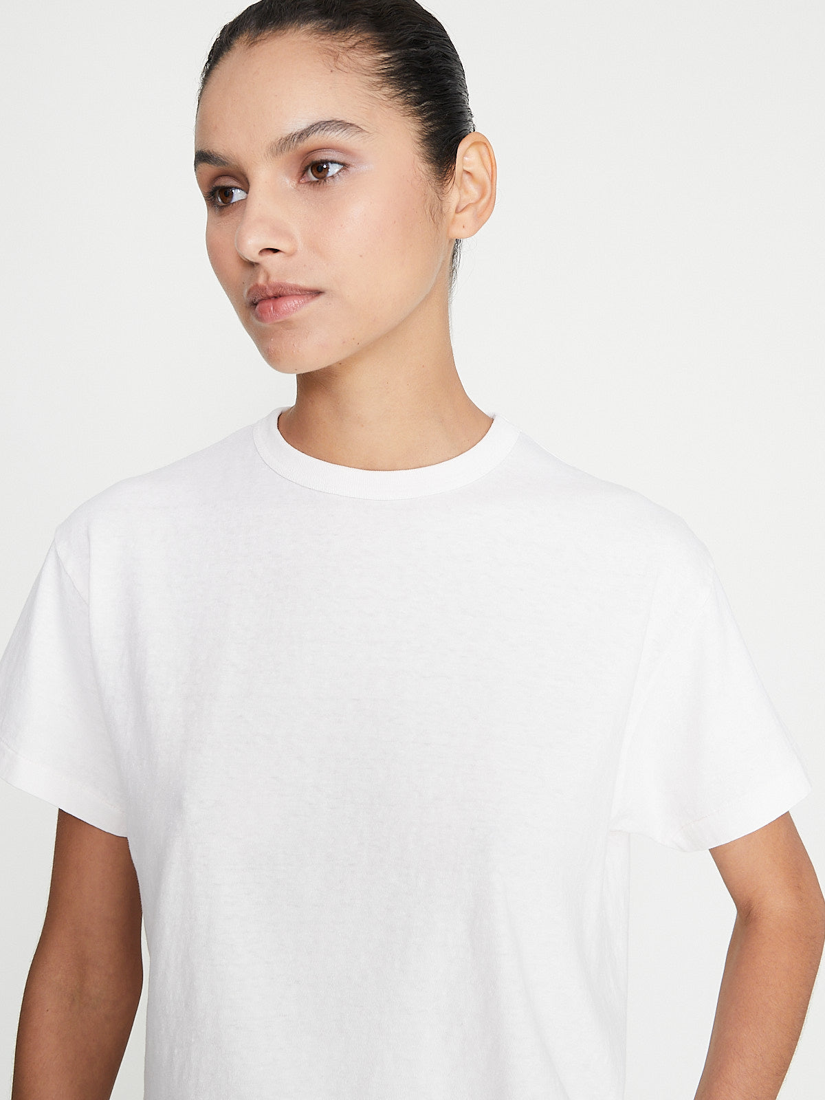 Boxy t-shirt in recycled off white Ochiwata cotton dyed using a pigment dye. Round reinforced neckline and capped sleeves. Constructed using antique loopwheel machines for a low tension, tubular knit without side seams.