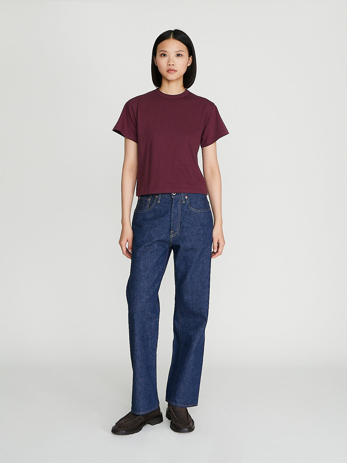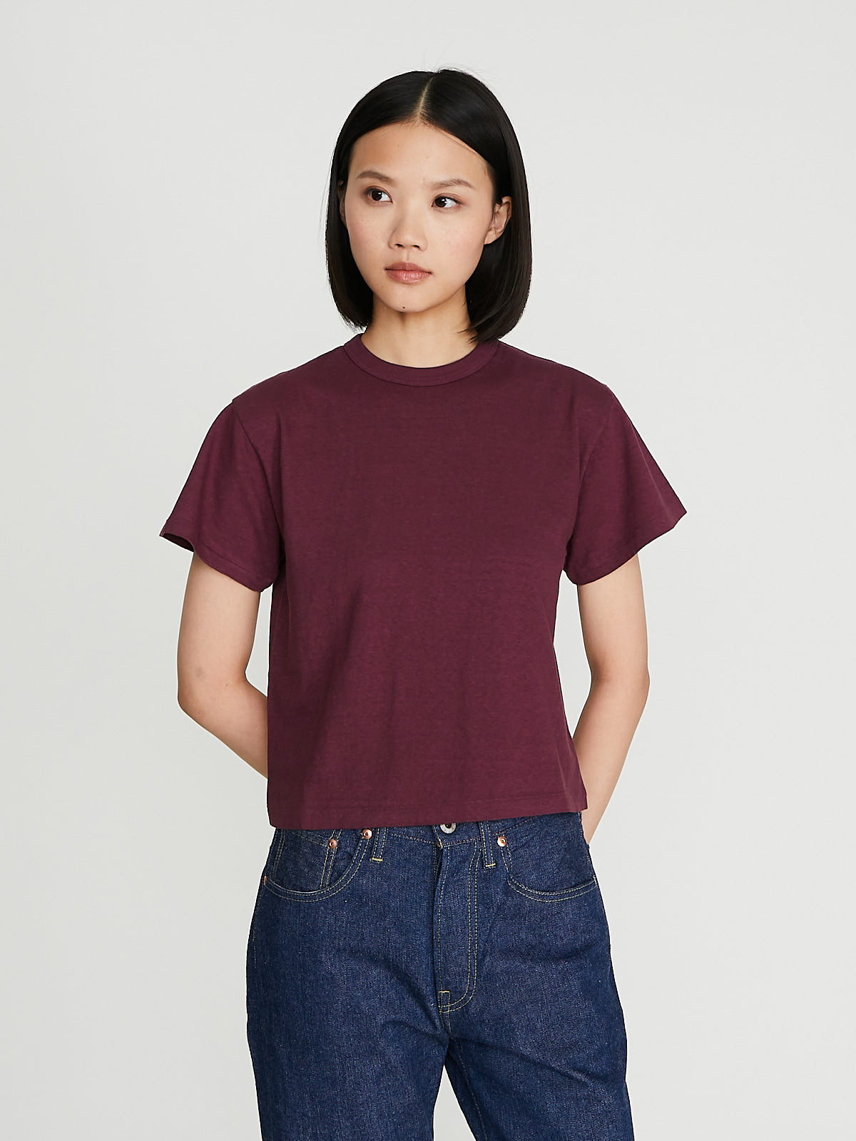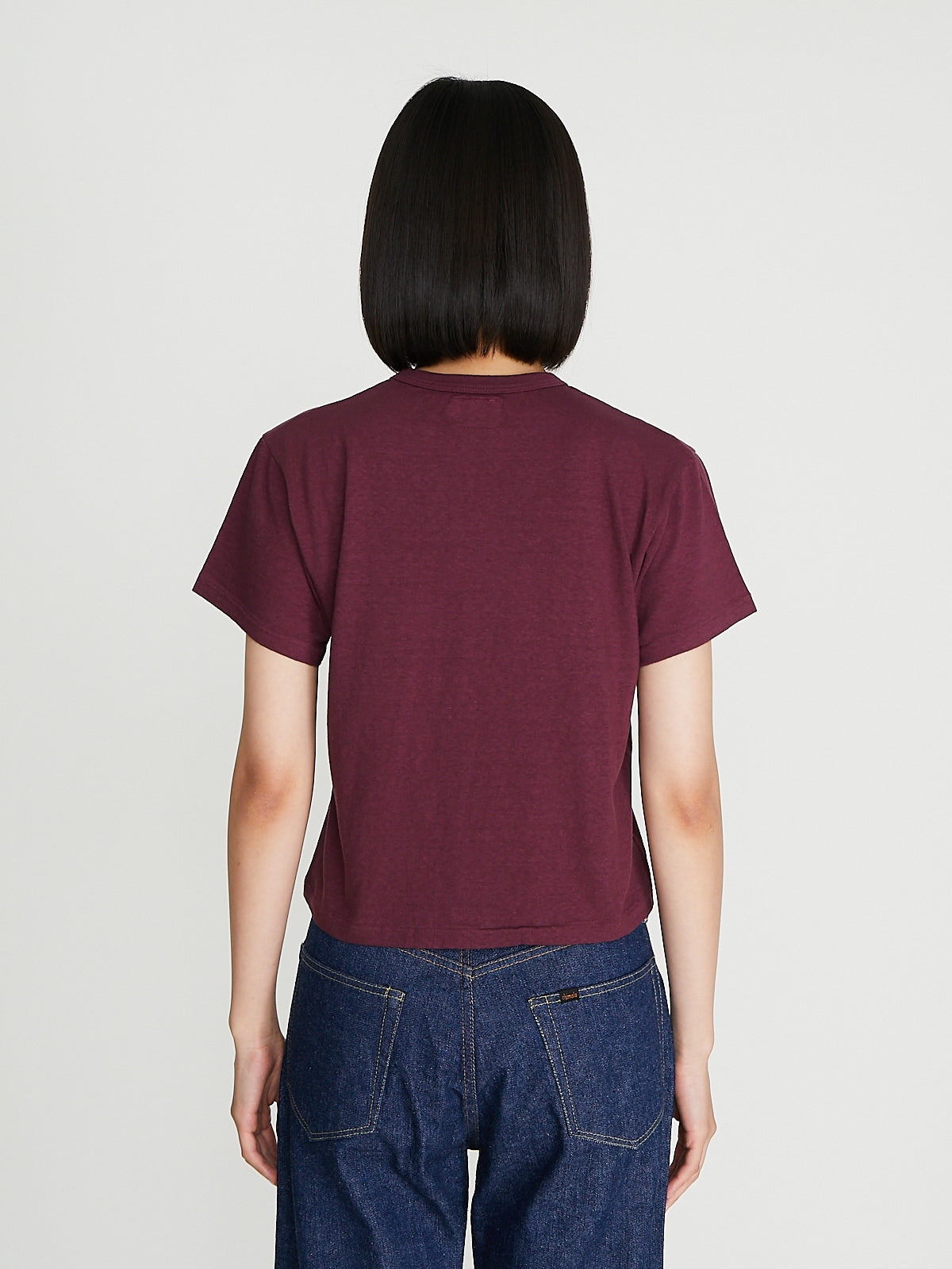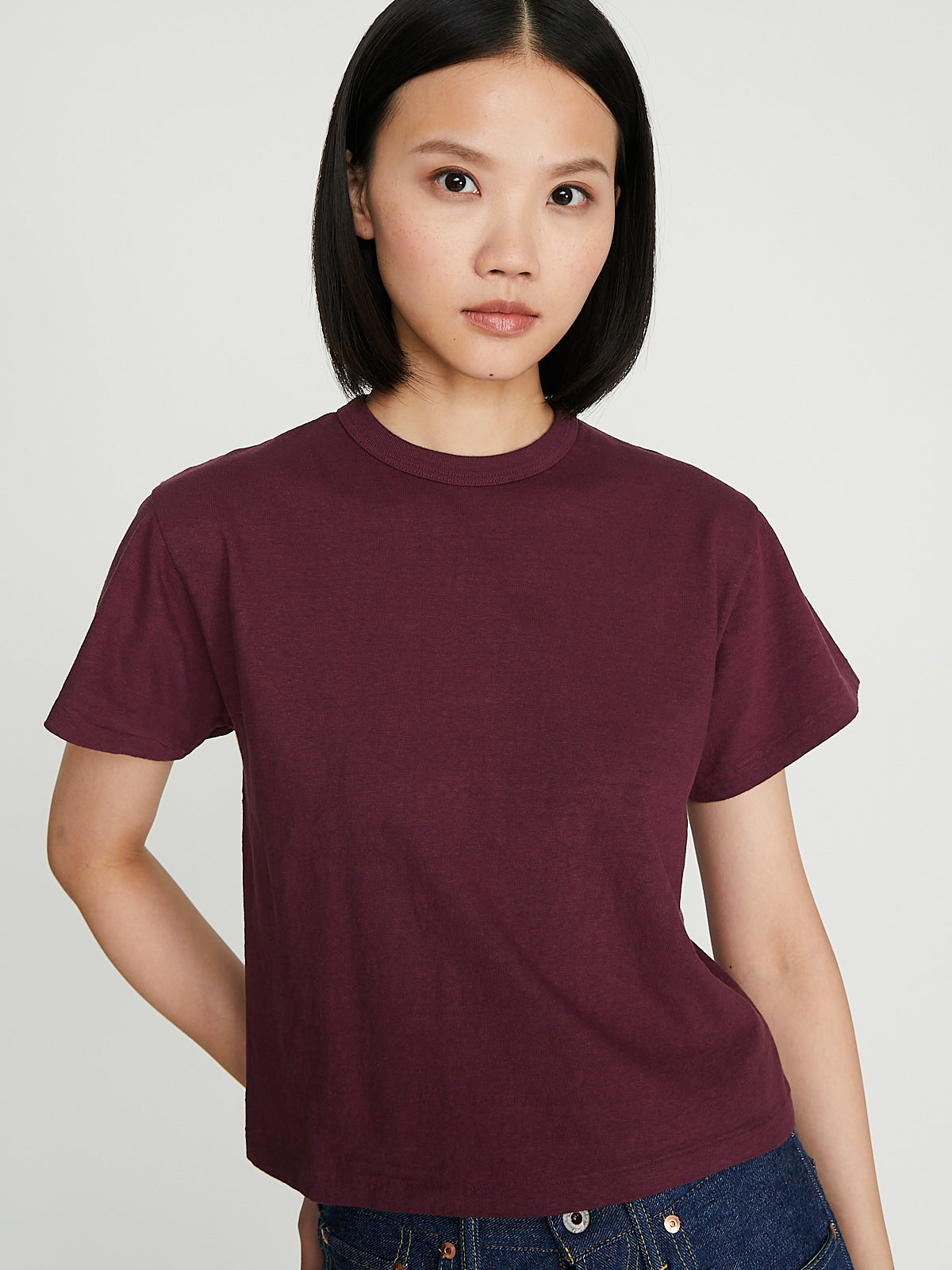 Boxy t-shirt in recycled burgundy Ochiwata (260gms) cotton. Round reinforced neckline and short sleeves. Constructed using antique loopwheel machines for a low tension, tubular knit without side seams.