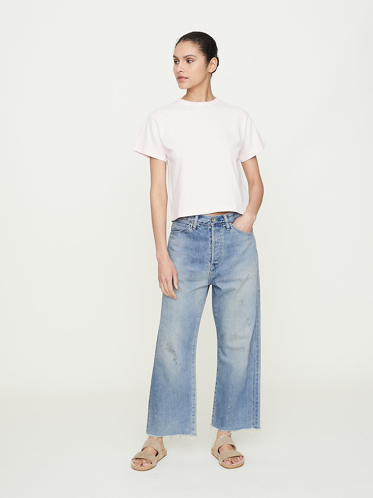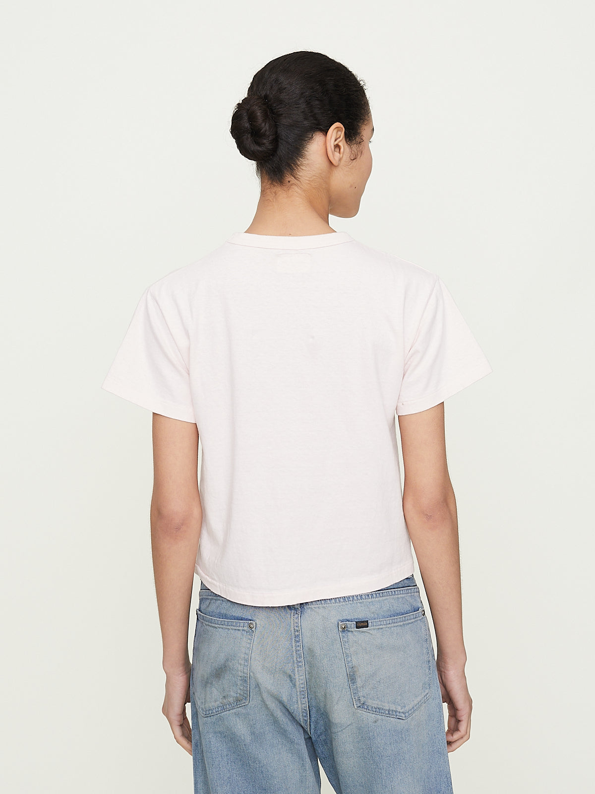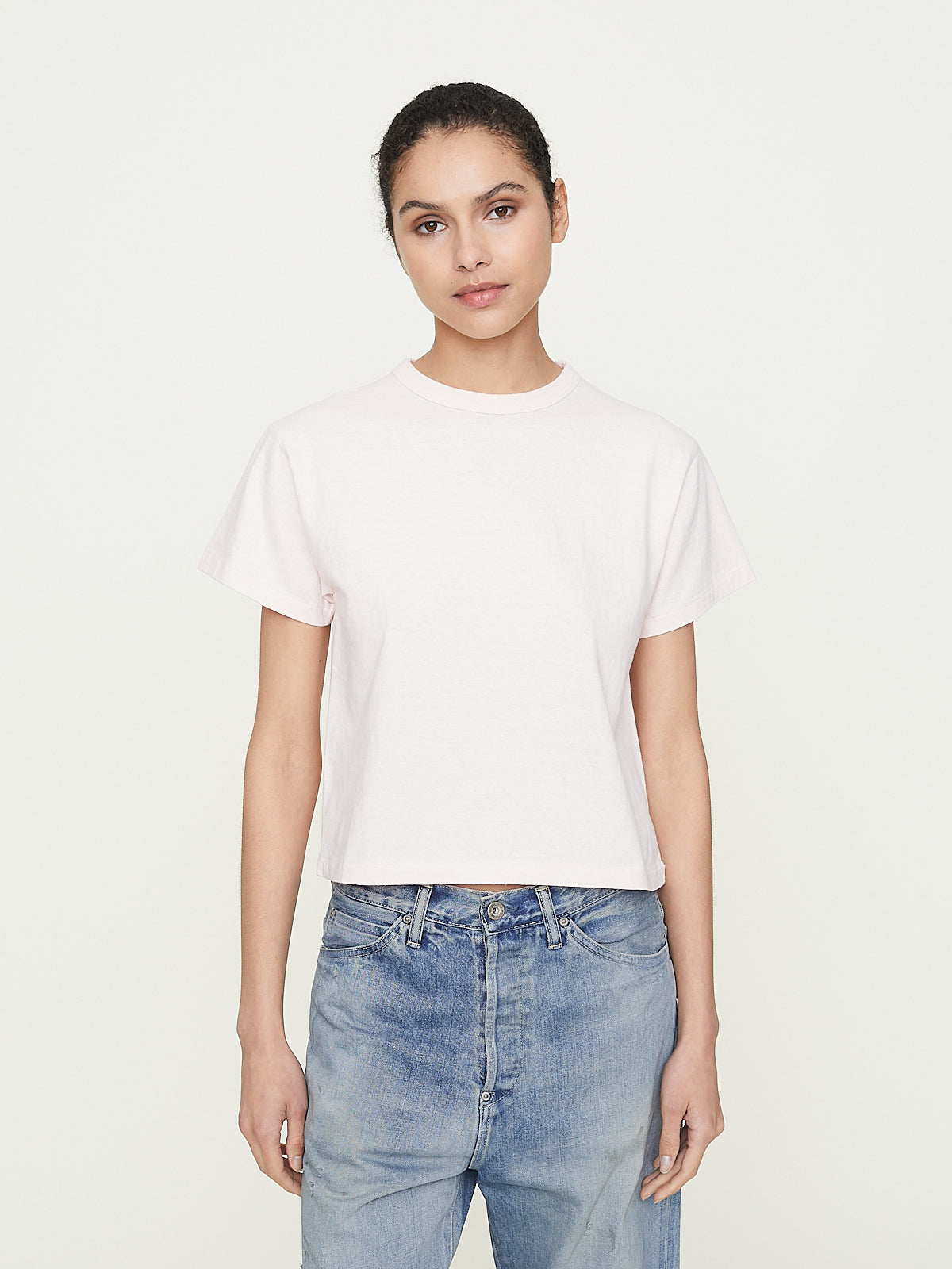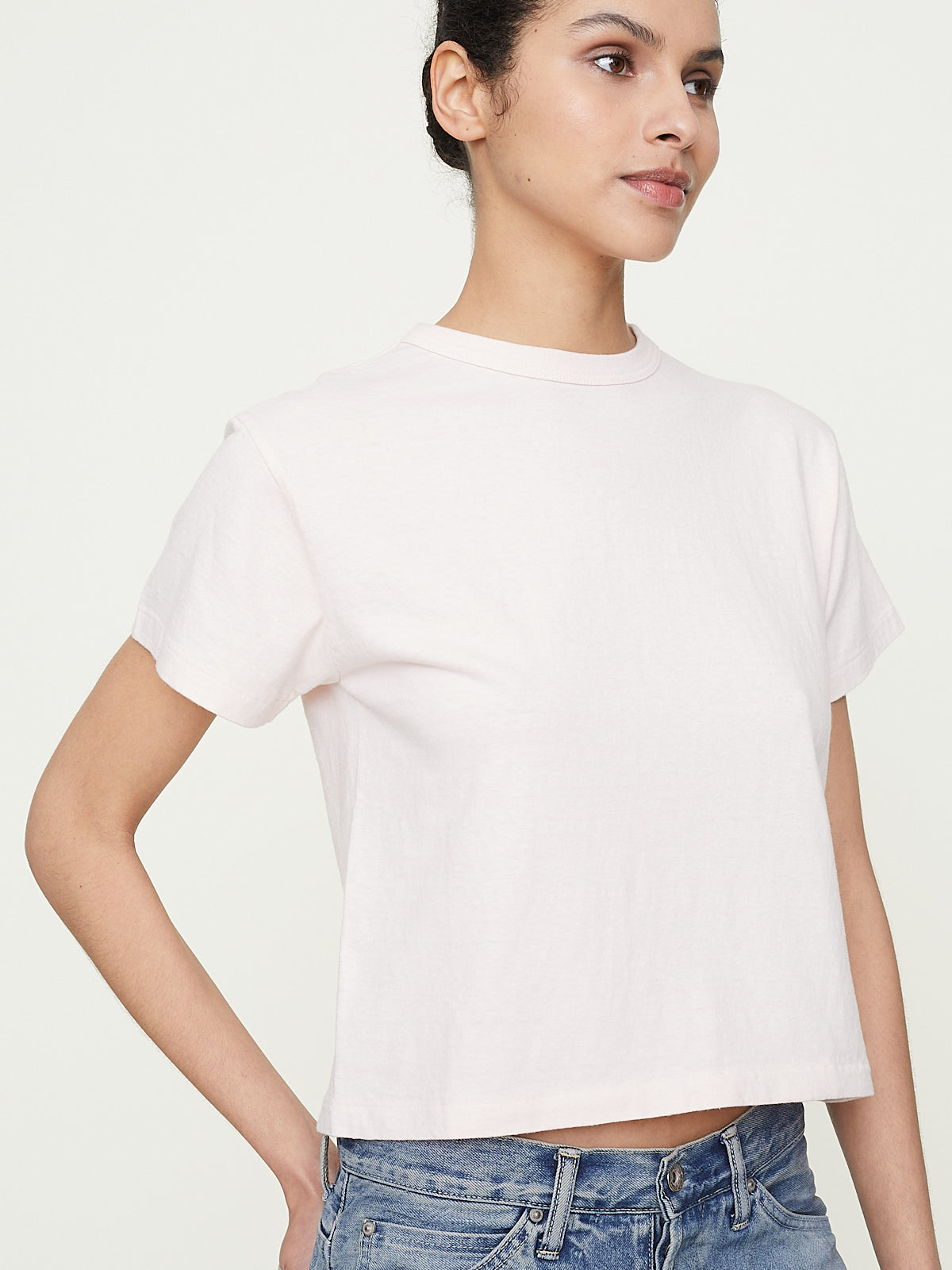 Boxy t-shirt in recycled pale mauve cotton. Round reinforced neckline and capped sleeves. Constructed using antique loopwheel machines for a low tension, tubular knit without side seams.