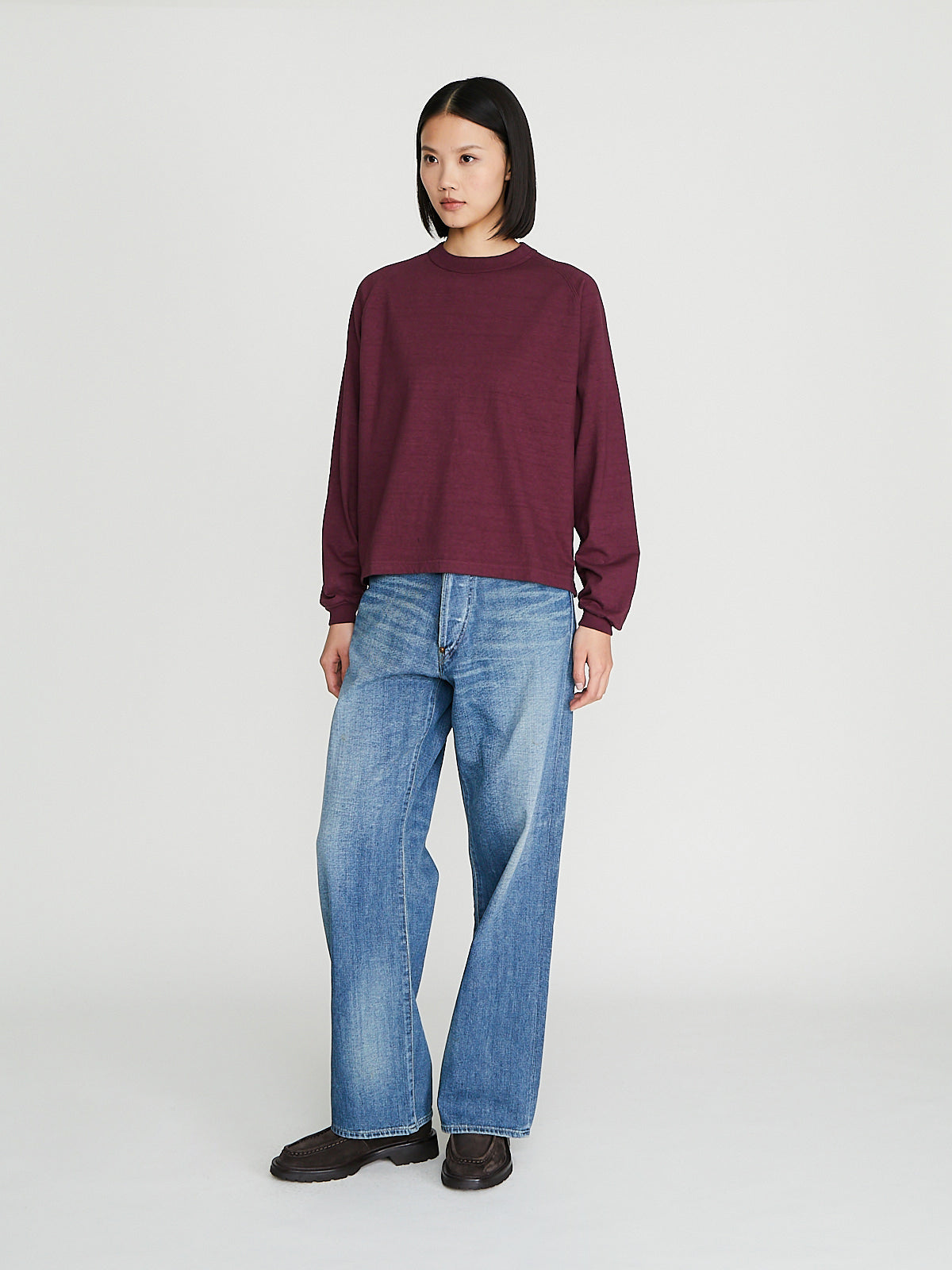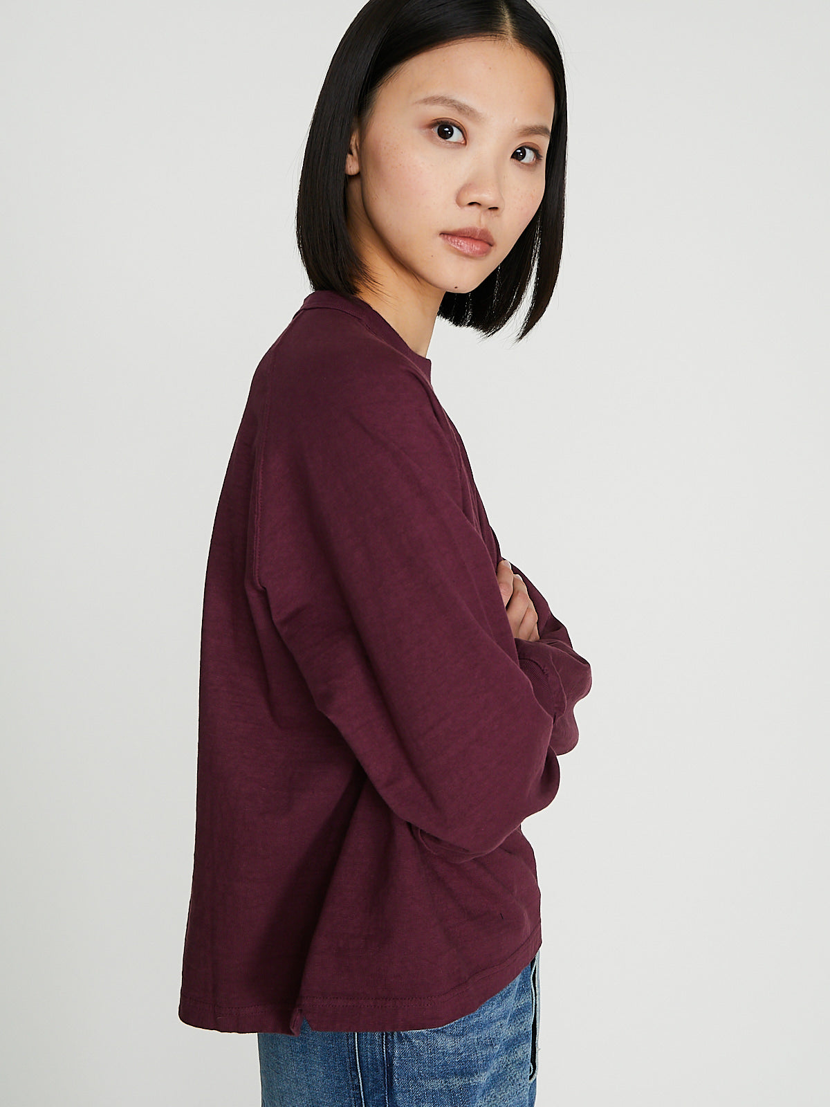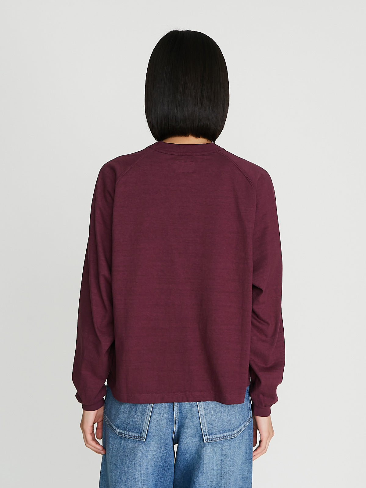Boxy long sleeved t-shirt in recycled burgundy Ochiwata (260gsm) cotton. Round reinforced neckline and long raglan sleeves with ribbed cuffs. Constructed using antique loopwheel machines for a low tension, tubular knit without side seams. Unisex.