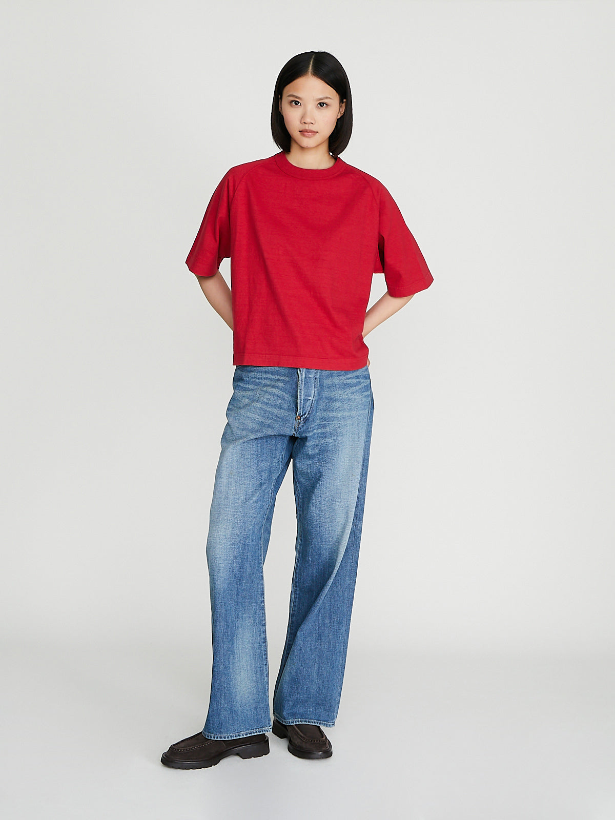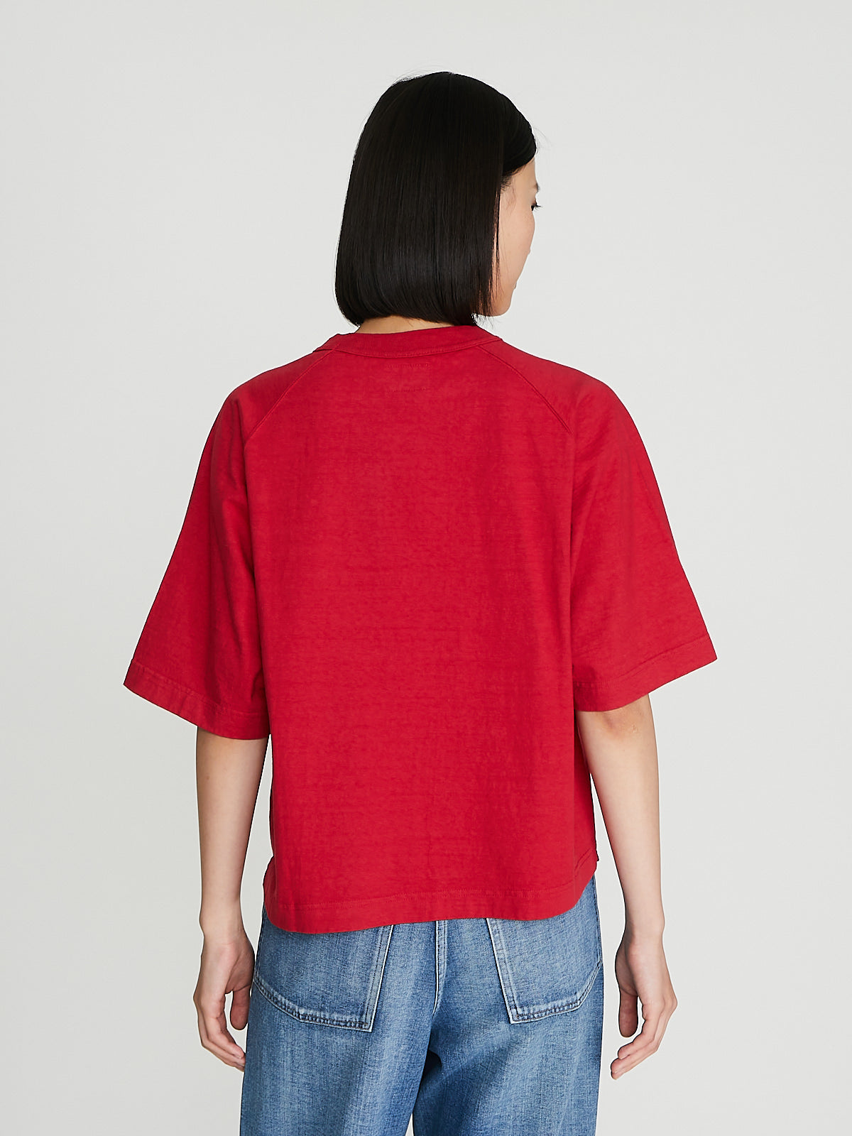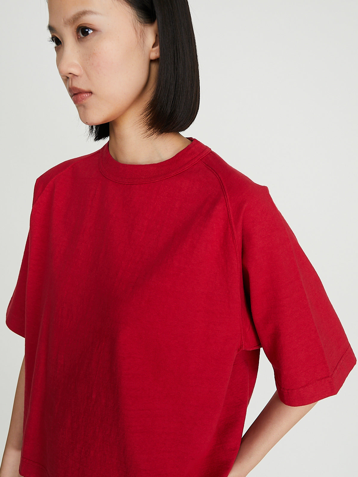 Boxy t-shirt in recycled red Ochiwata (260gsm) cotton. Round reinforced neckline and short raglan sleeves with ribbed cuffs. Constructed using antique loopwheel machines for a low tension, tubular knit without side seams. Unisex.