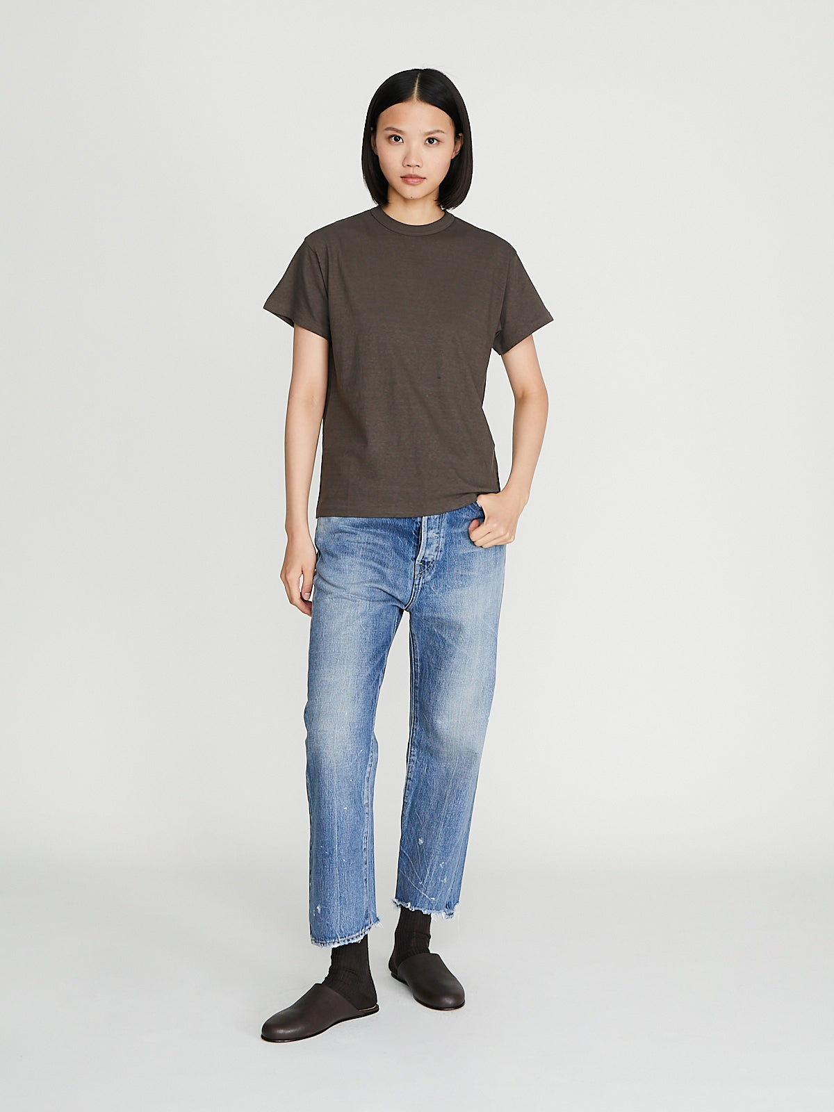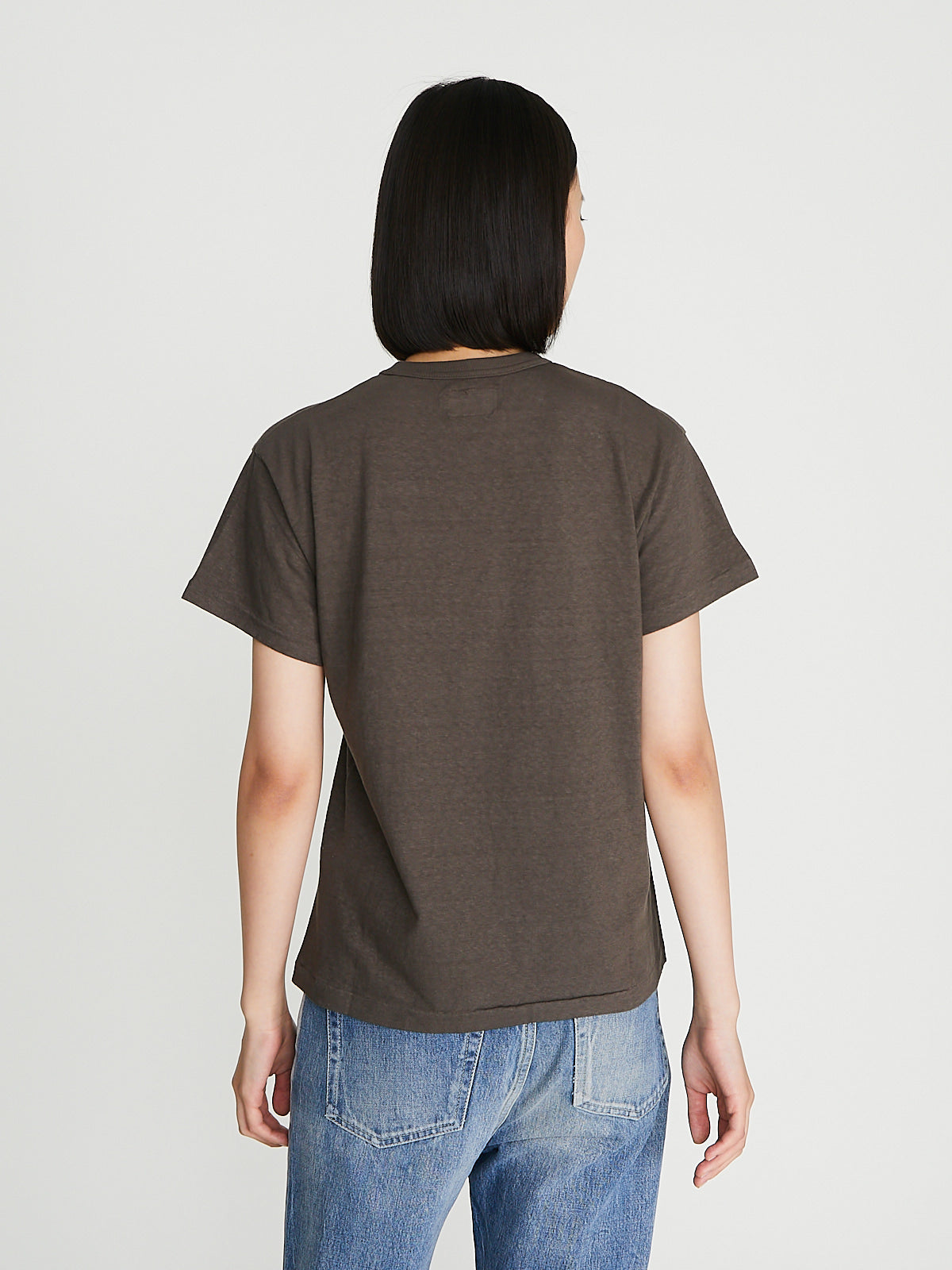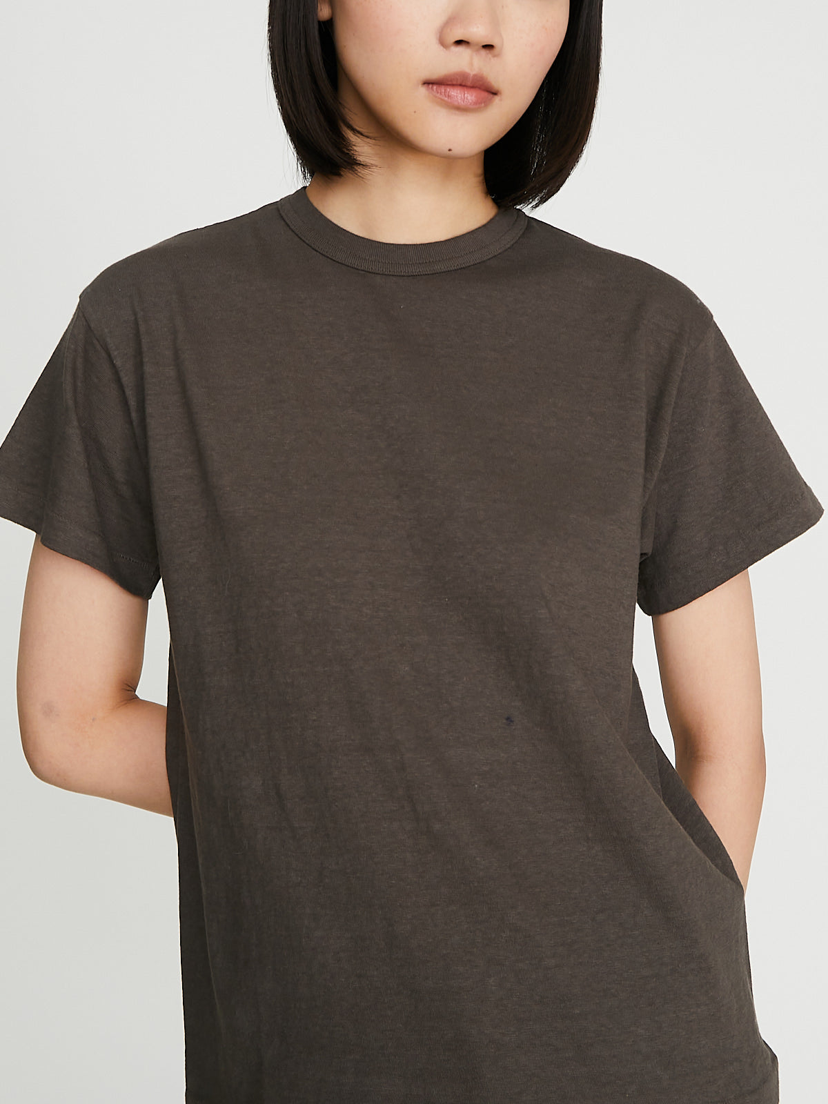 Classic t-shirt in recycled dark khaki (260gsm) cotton. Round neckline that has been reinforced and short sleeves. Constructed using antique loopwheel machines for a low tension, tubular knit without side seams. Regular fit.