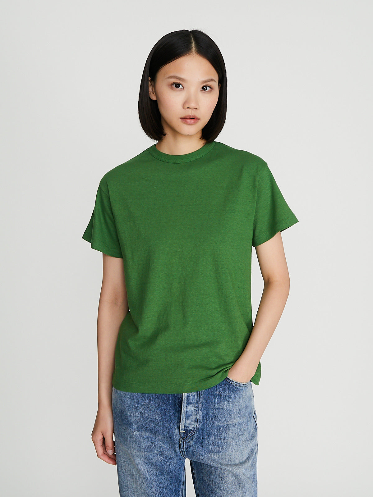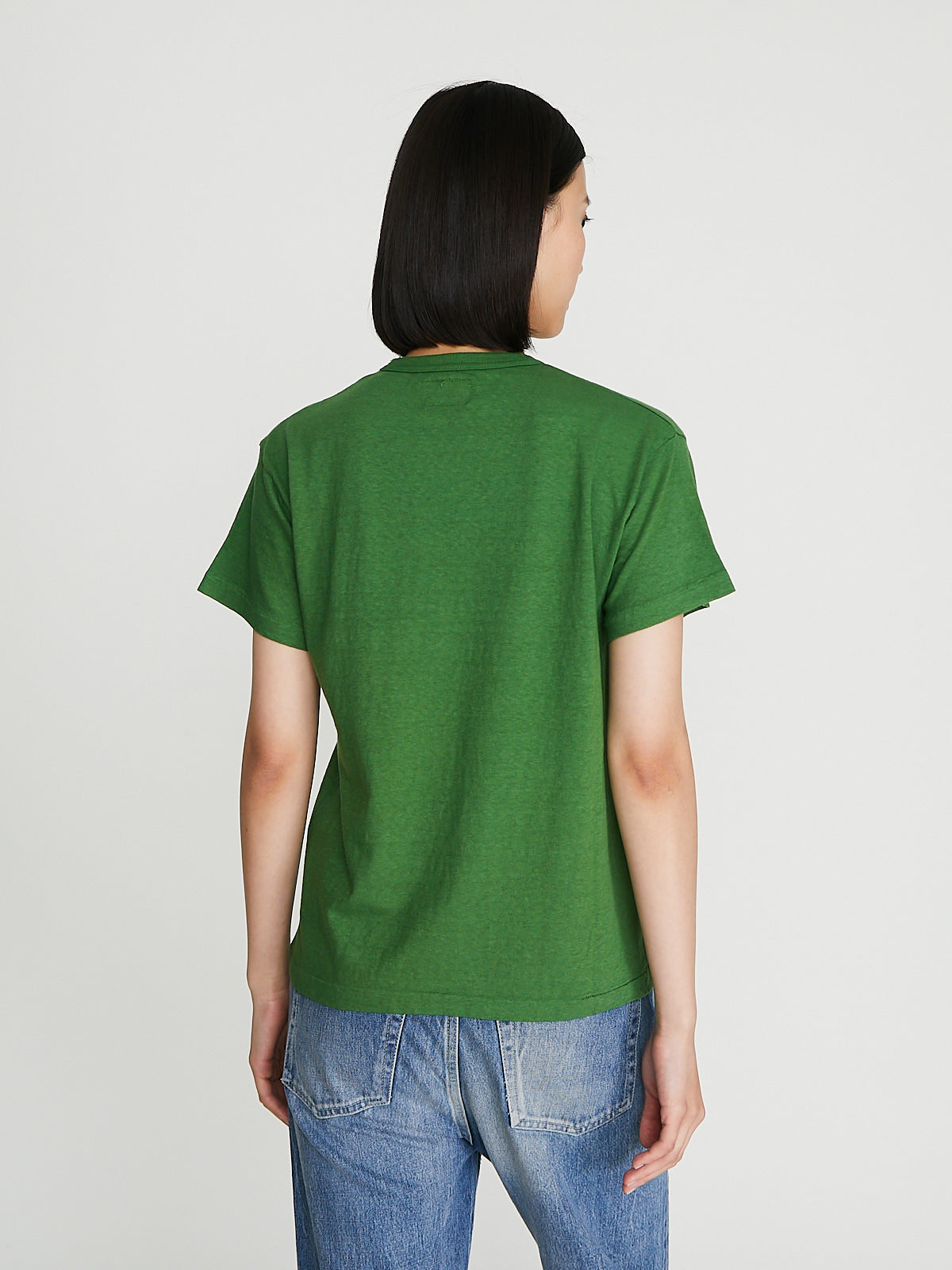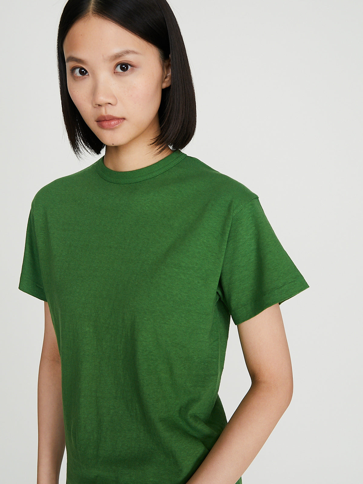 Classic t-shirt in recycled green (260gsm) cotton. Round neckline that has been reinforced and short sleeves. Constructed using antique loopwheel machines for a low tension, tubular knit without side seams. Regular fit.