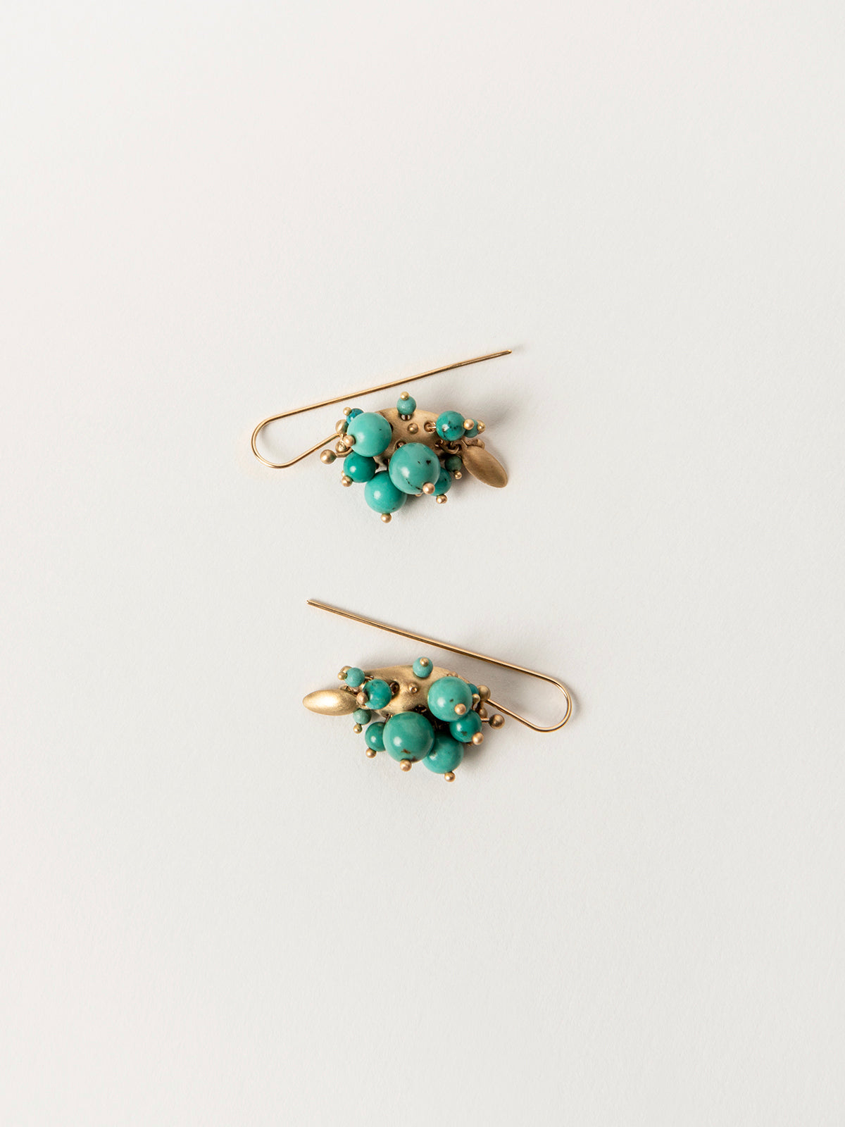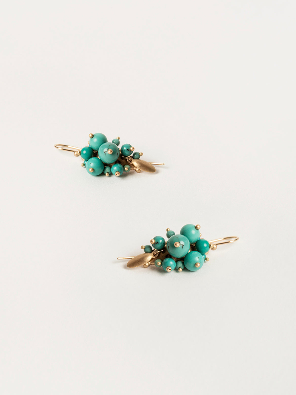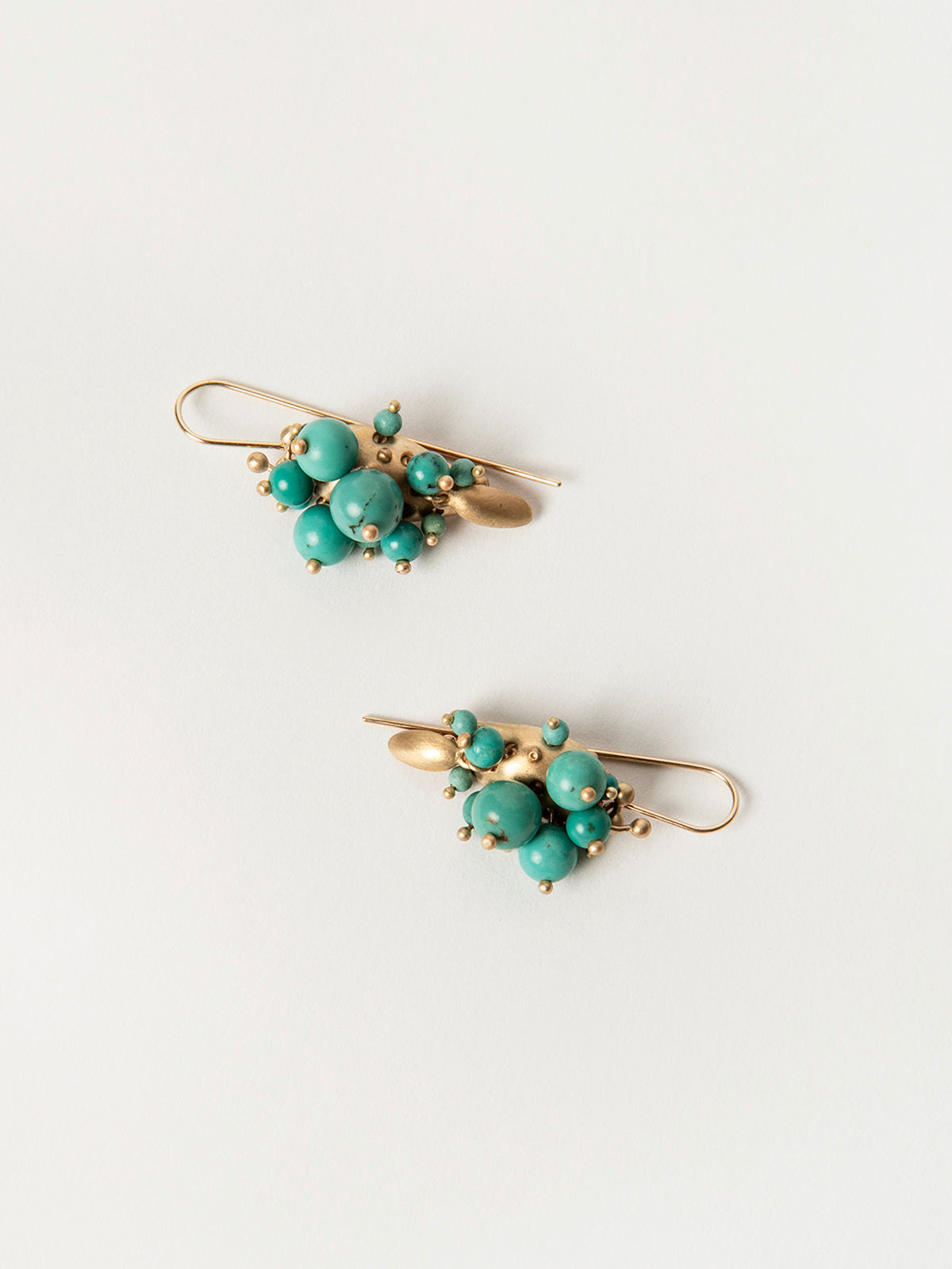 Bug earrings in 10k yellow gold with turquoise bead clusters. Features an ear wire backing.