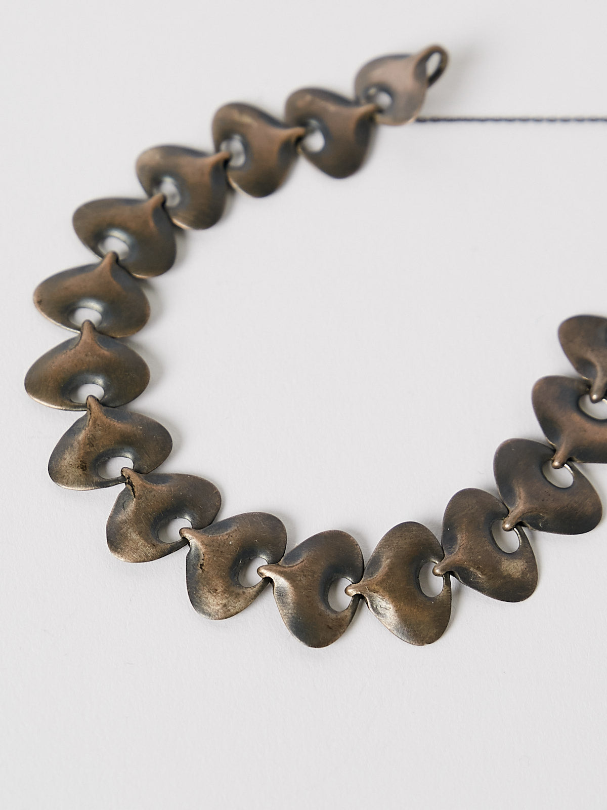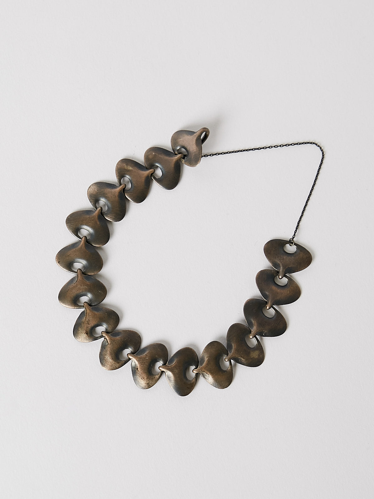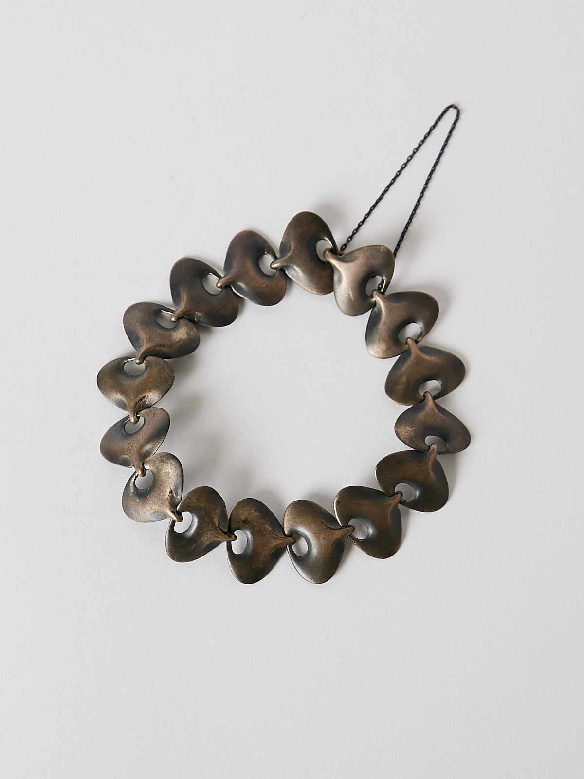 Bracelet with small succulent-shaped links in brushed oxidised sterling silver. Features a hook fastening and a safety chain.