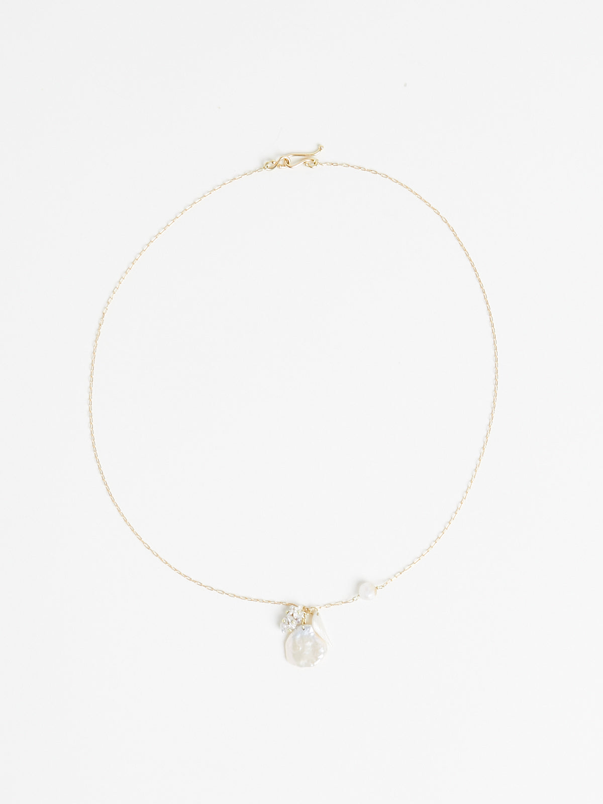 Necklace with a delicate 18k yellow gold chain and a Keshi pearl cluster, a natural pearl and a pearl wing pendant. Features a fish hook clasp.