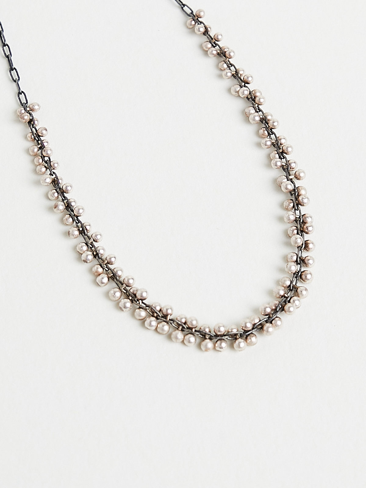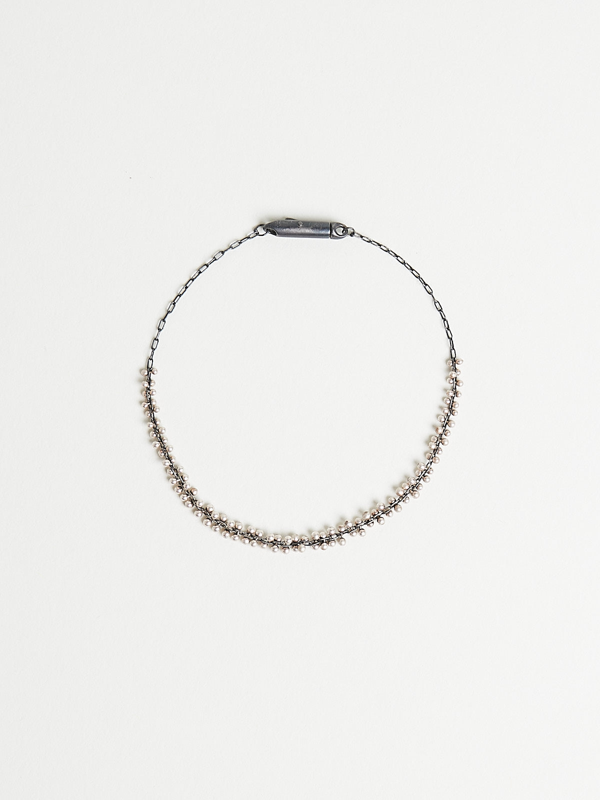 Bracelet with a delicate chain in oxidised sterling silver with a cluster of tiny sterling silver beads. Features a clip fastening.