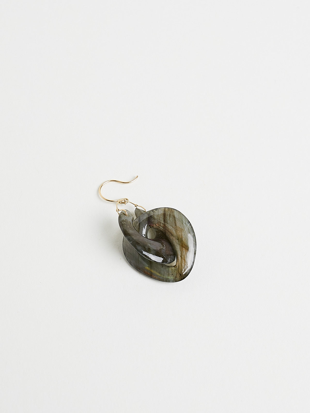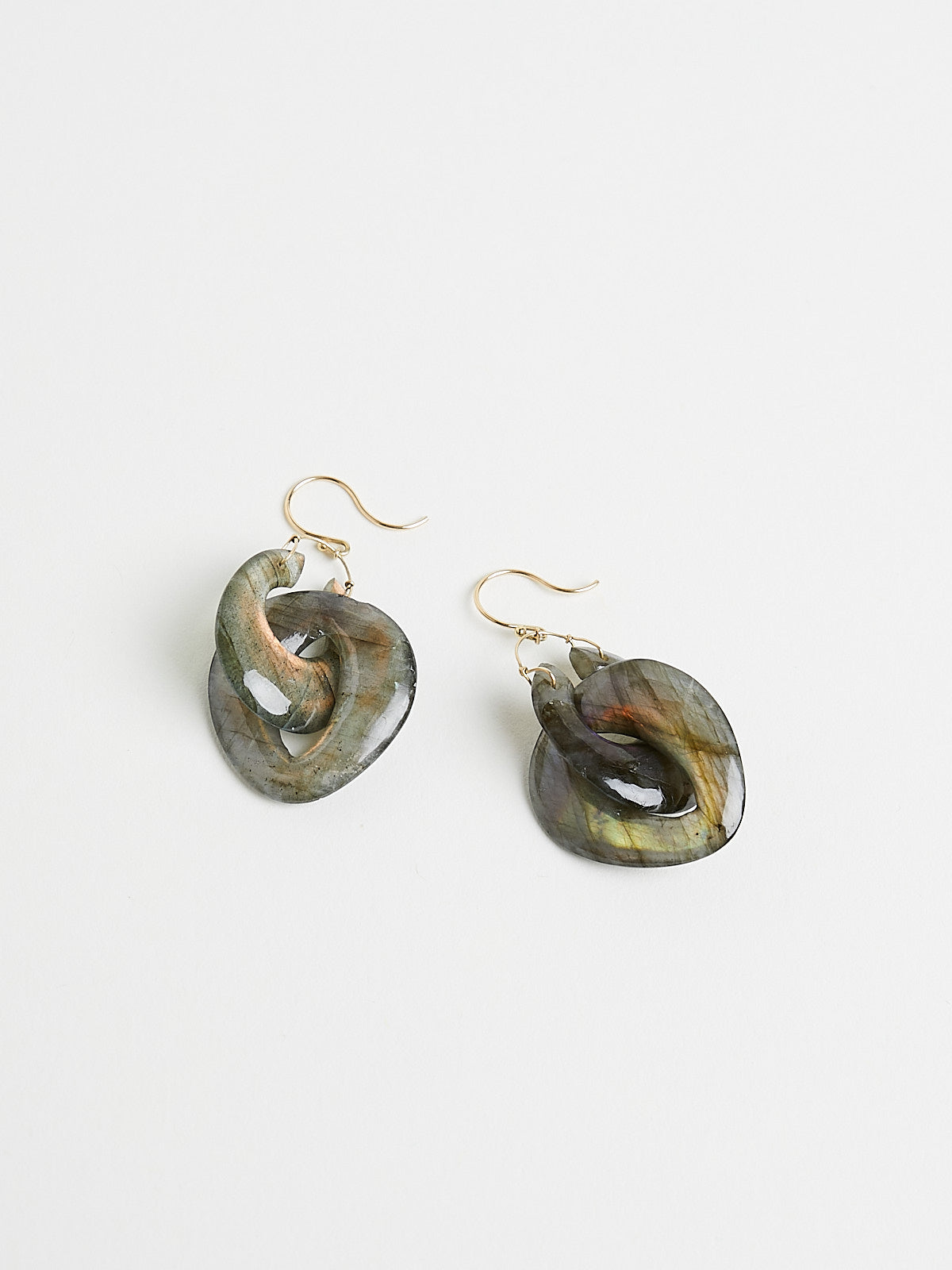 Peacock-link earrings made from labradorite. Features an ear wire backing in 18k yellow gold.