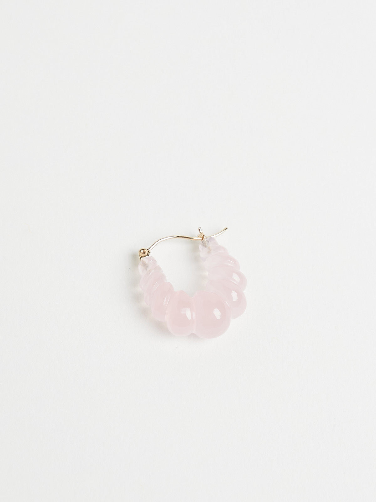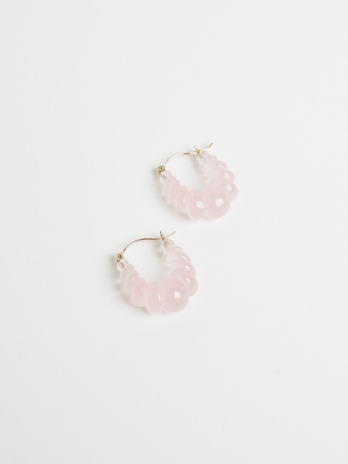 Ear hoops made from handcarved rose quartz. Features a hinged backing in 18k yellow gold.
