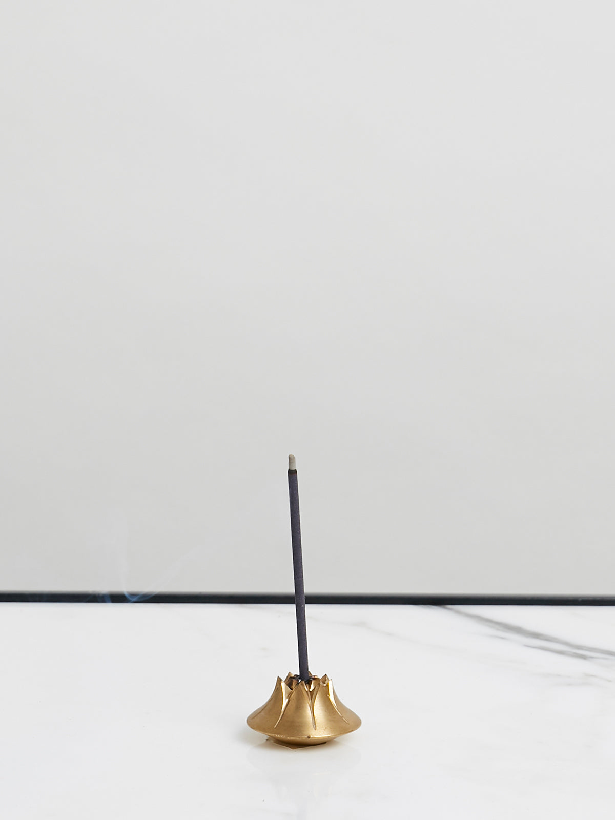 Incense holder in solid brass. Holds cone, spiral, short or long stick incense. Comes in a wooden box. Made in Arizona.