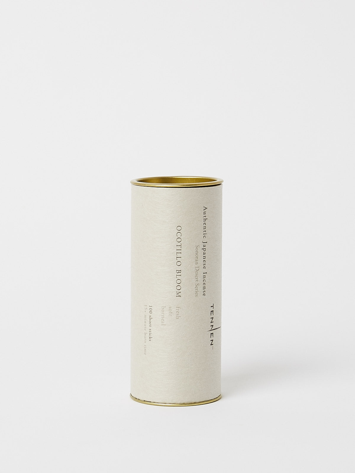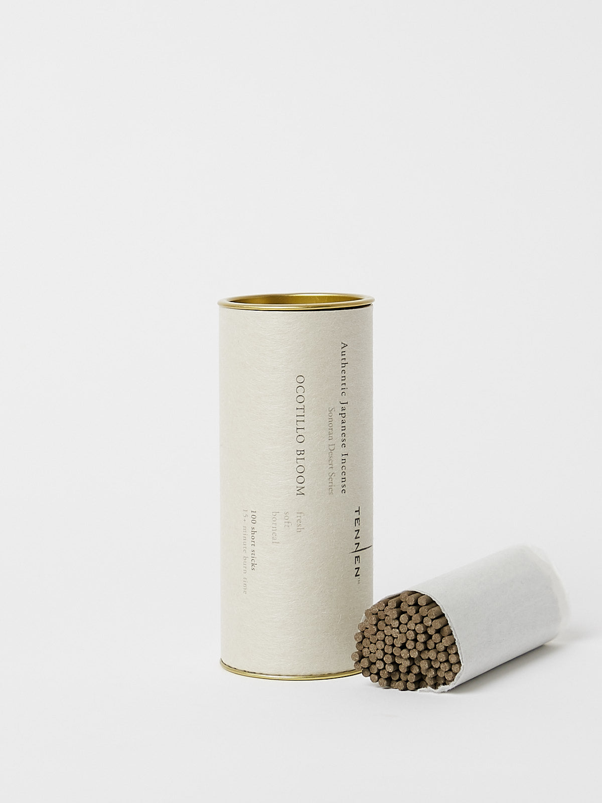 Set of 100 short incense sticks. Comes in a metal cylinder.