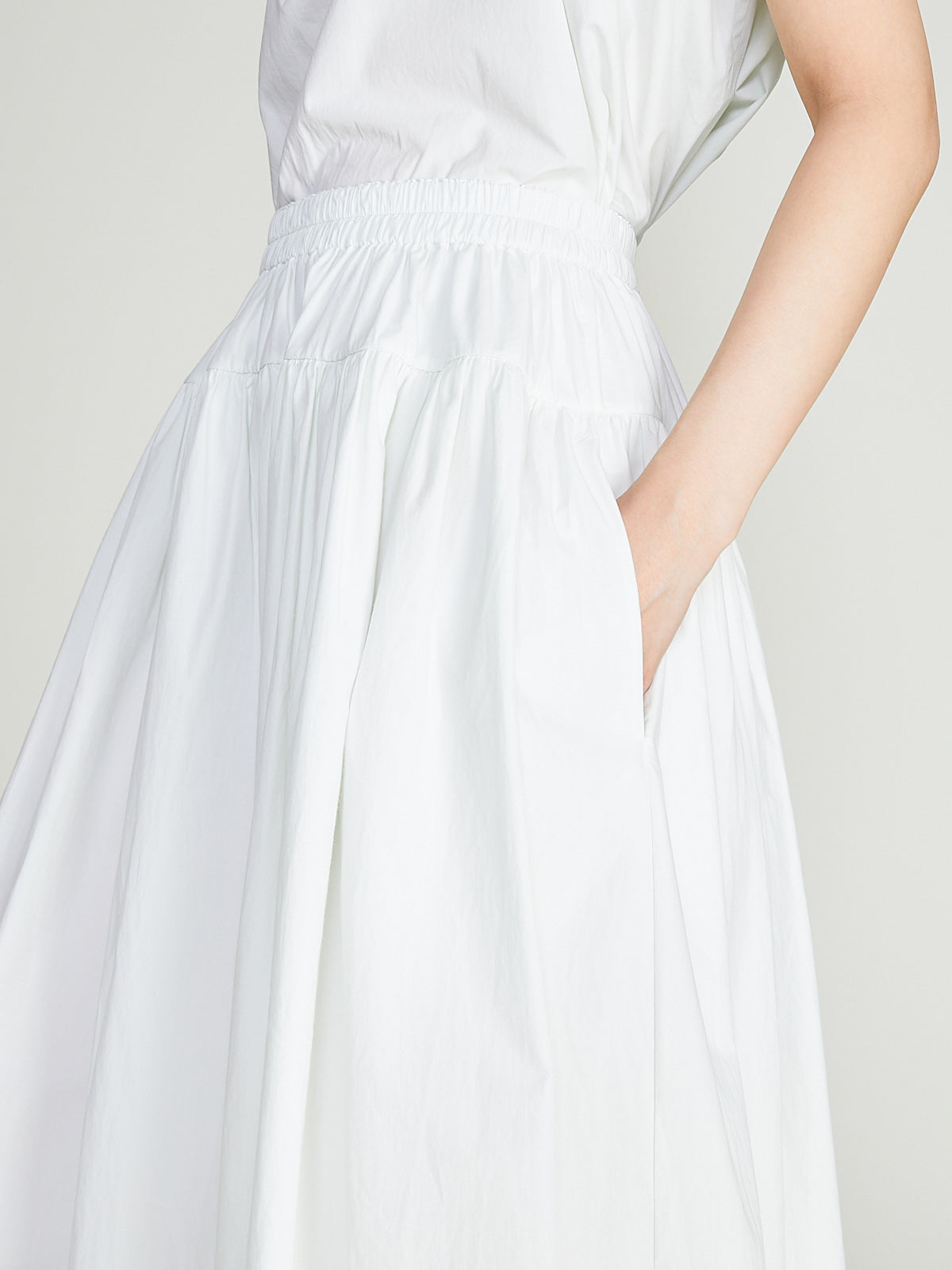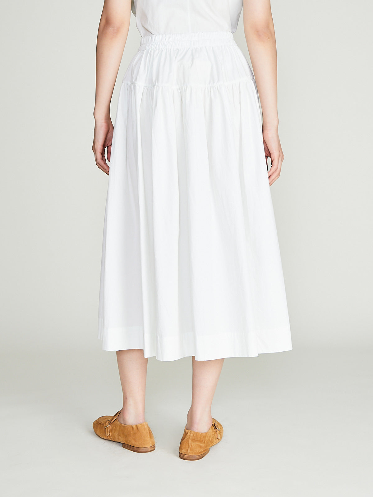 Tiered and gathered skirt in greeny white paper cotton poplin. Pull-on style with an elasticated waistband. Side seem pockets. A-line silhouette. Cuts below-the-knee.