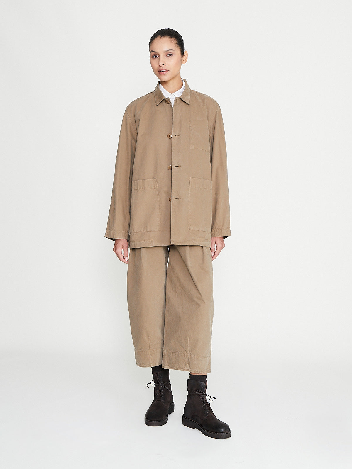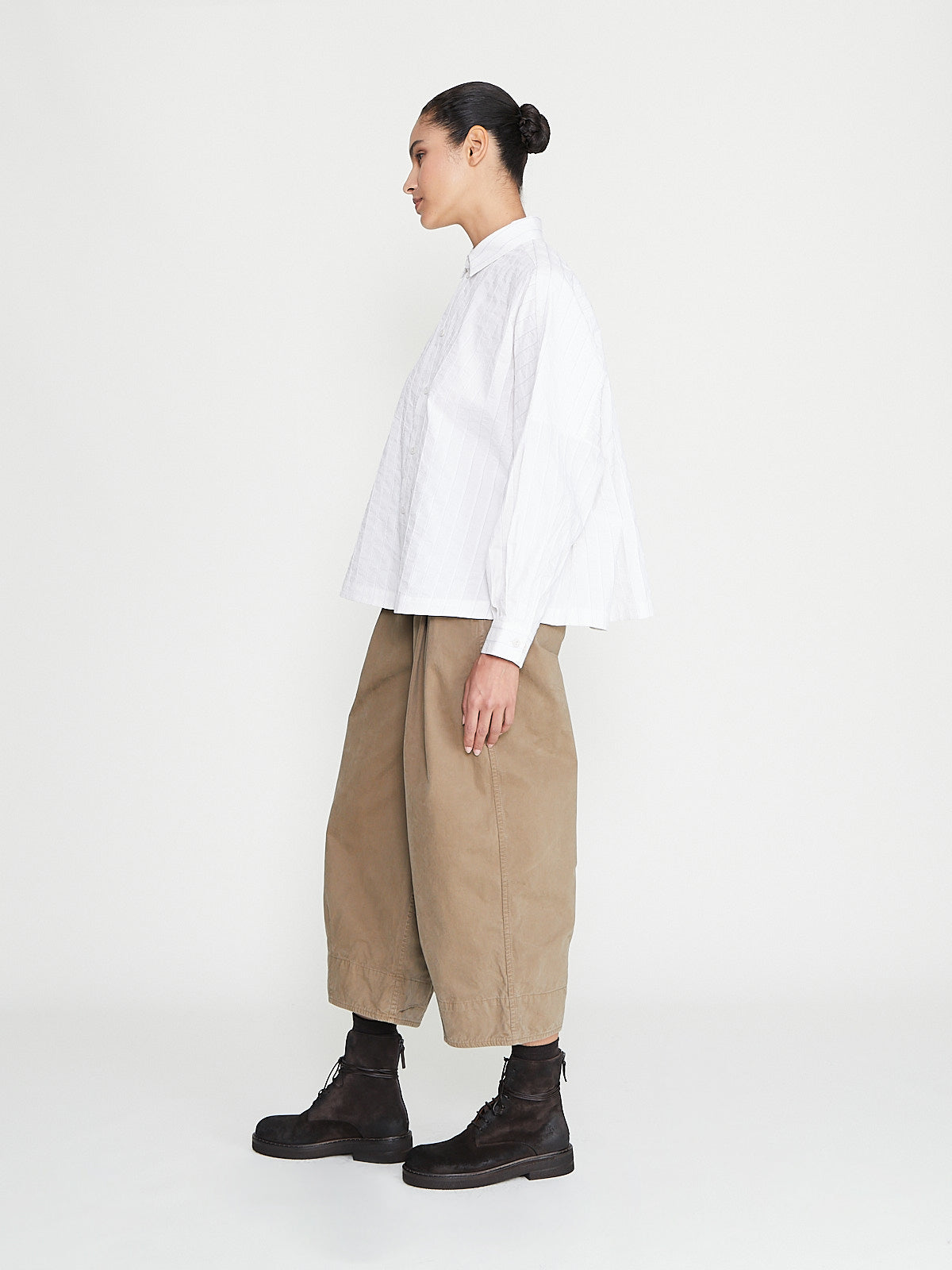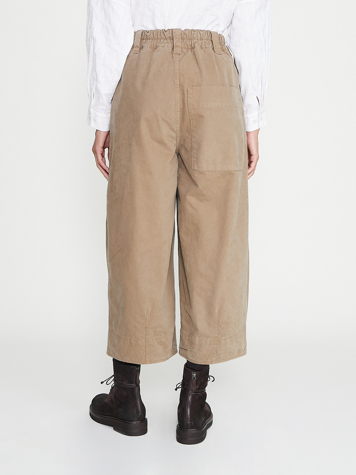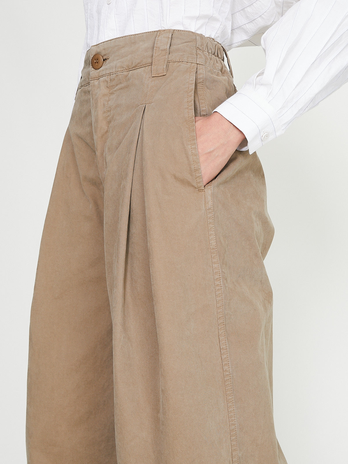 Wide tailored trouser in a beige garment-dyed mid-weight cotton work twill with a washed finish. High waist with box pleats on the front and an elasticated back. Side seam pockets and a large single back pocket. Long darts go vertically from the hem towards the knee to give a bold shaped silhouette. Cropped leg that taper at the cuffs. Unisex.
