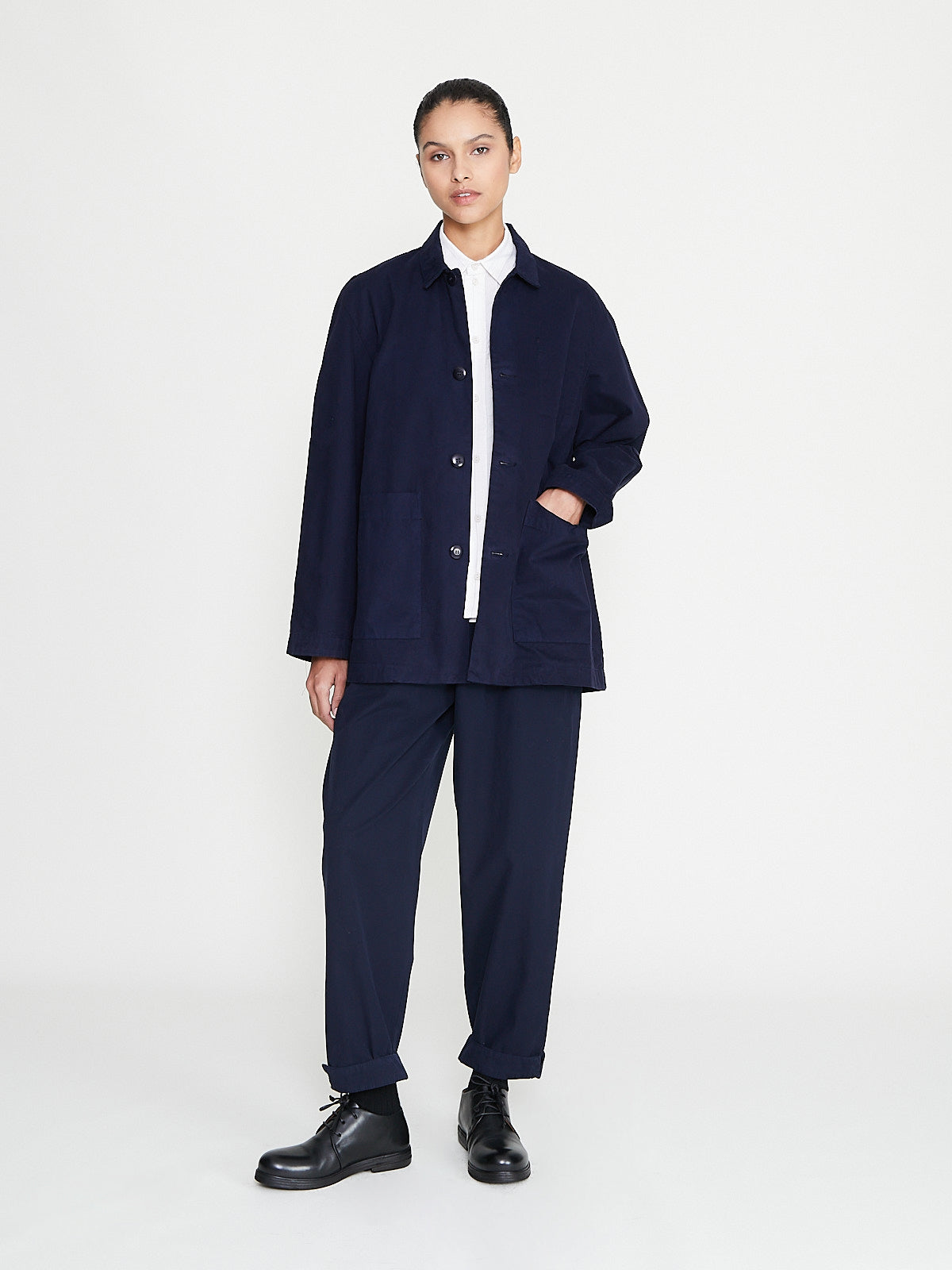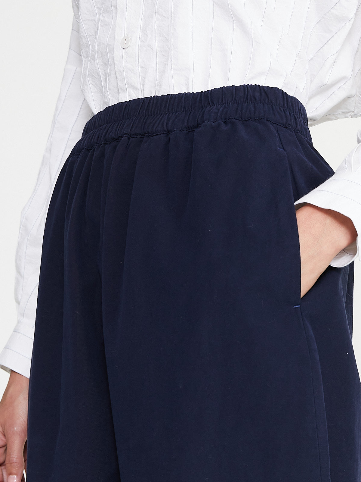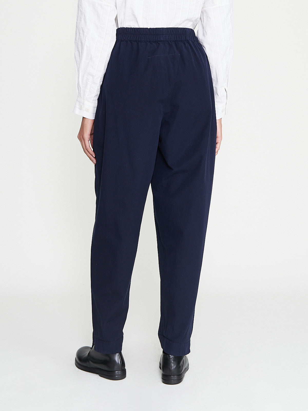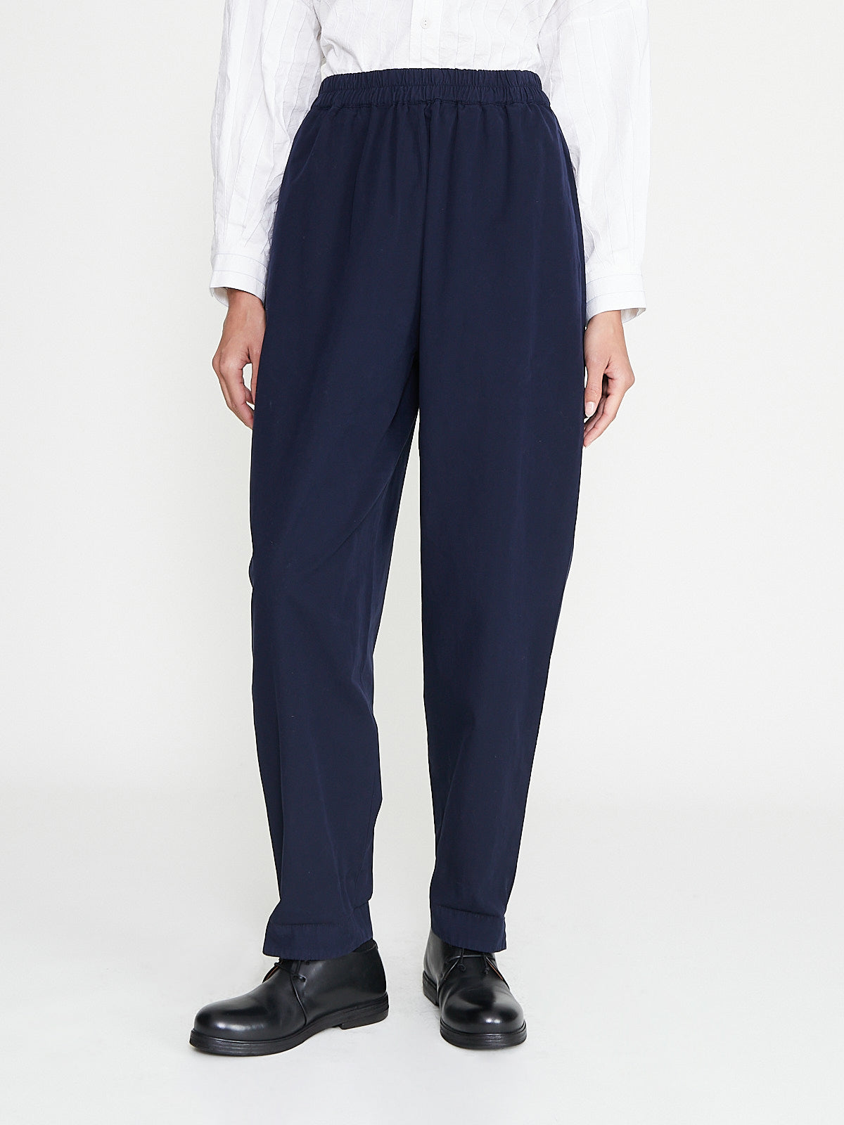 Generous trouser in ink blue fine canvas, a soft twill cotton in a trans-seasonal weight. Pull-on style with an elasticated waistband and side seam pockets. Full-length legs that taper at the ankle. Features small side splits at the hem. Unisex.