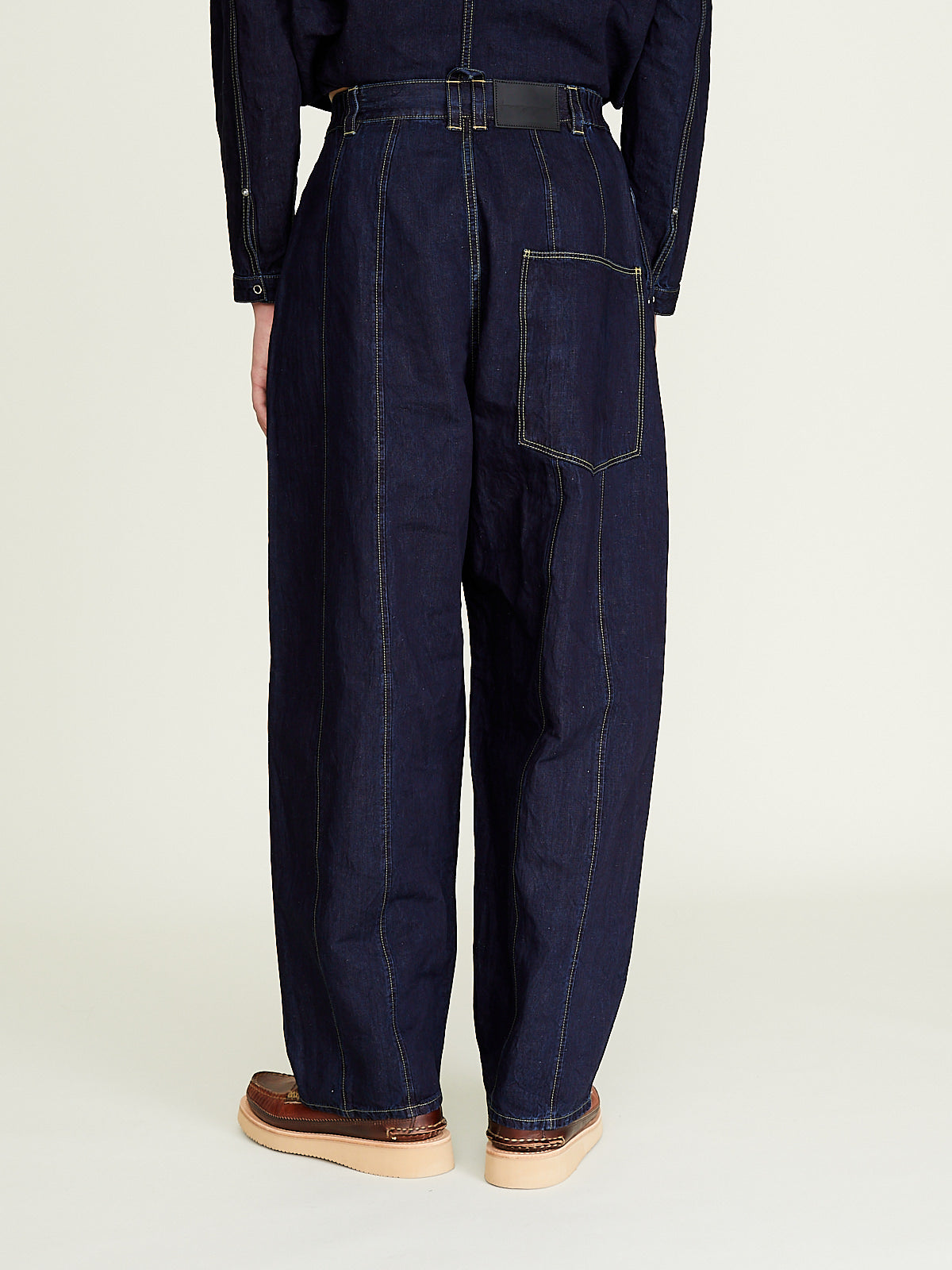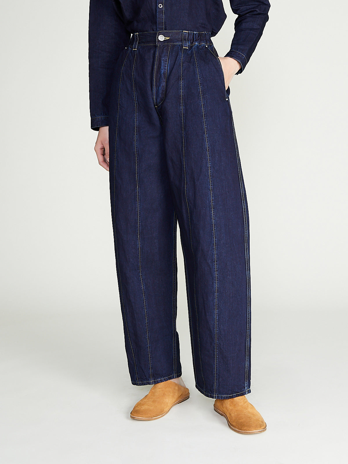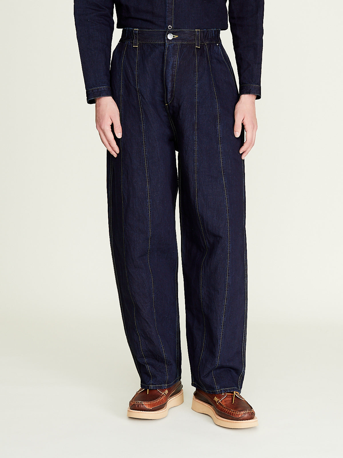 Voluminous unisex jeans in 8oz indigo cotton denim. Elasticated sides at waist, single button fastening and a zip fly. Belt loops, , slash pockets on the front and a generous back pocket. Features panelling at legs for a loose, barrel shape. Contrasting topstitching throughout.