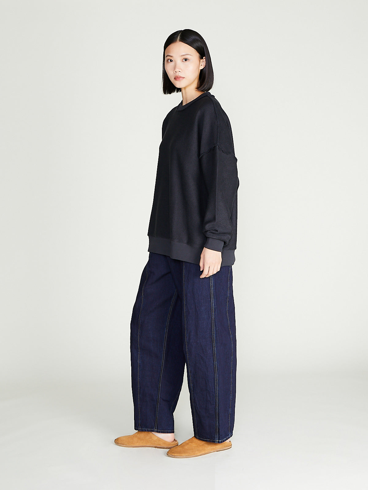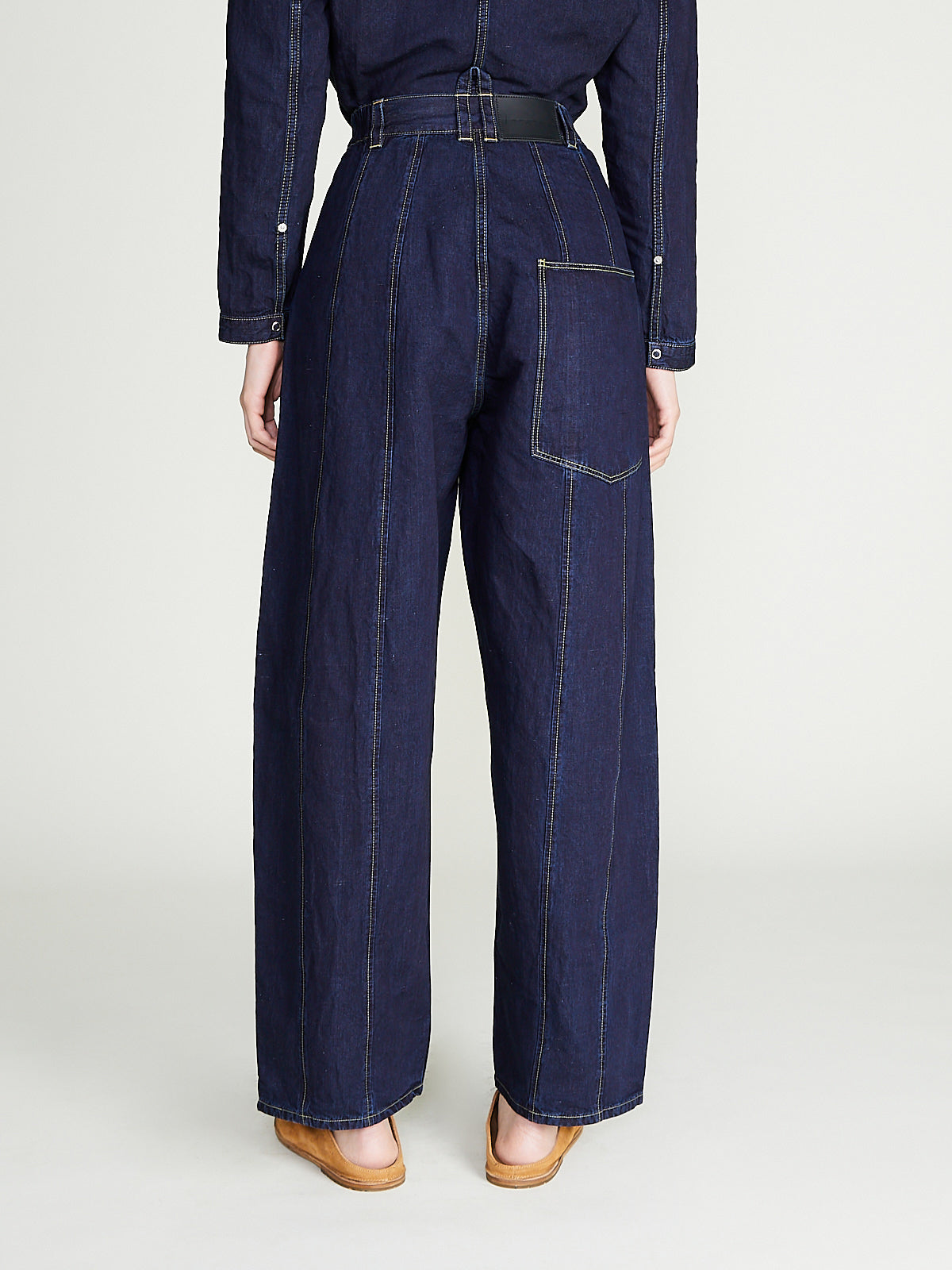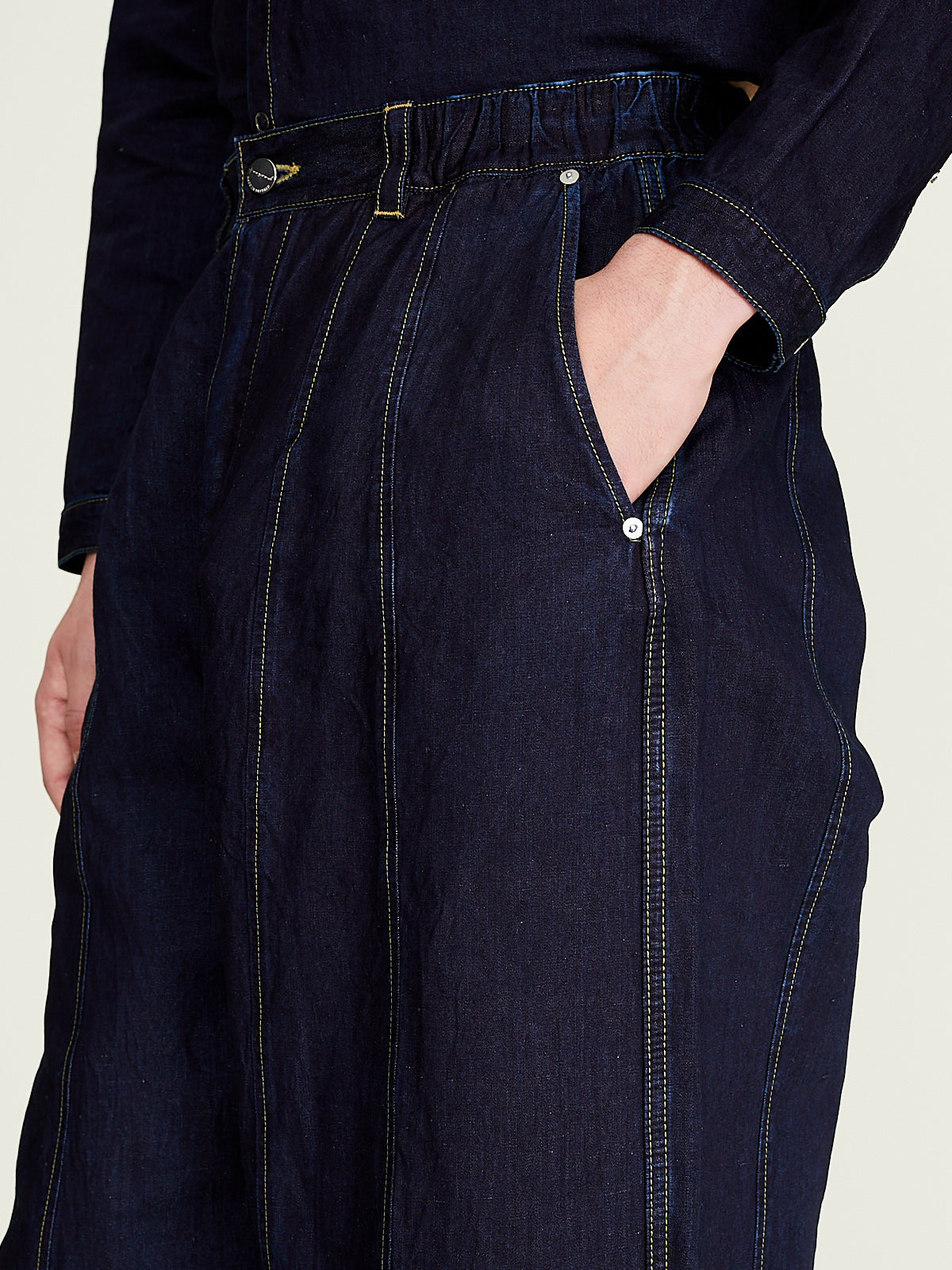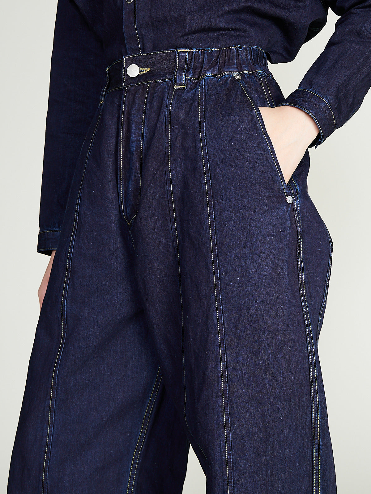 Voluminous unisex jeans in 8oz indigo cotton denim. Elasticated sides at waist, single button fastening and a zip fly. Belt loops, , slash pockets on the front and a generous back pocket. Features panelling at legs for a loose, barrel shape. Contrasting topstitching throughout.
