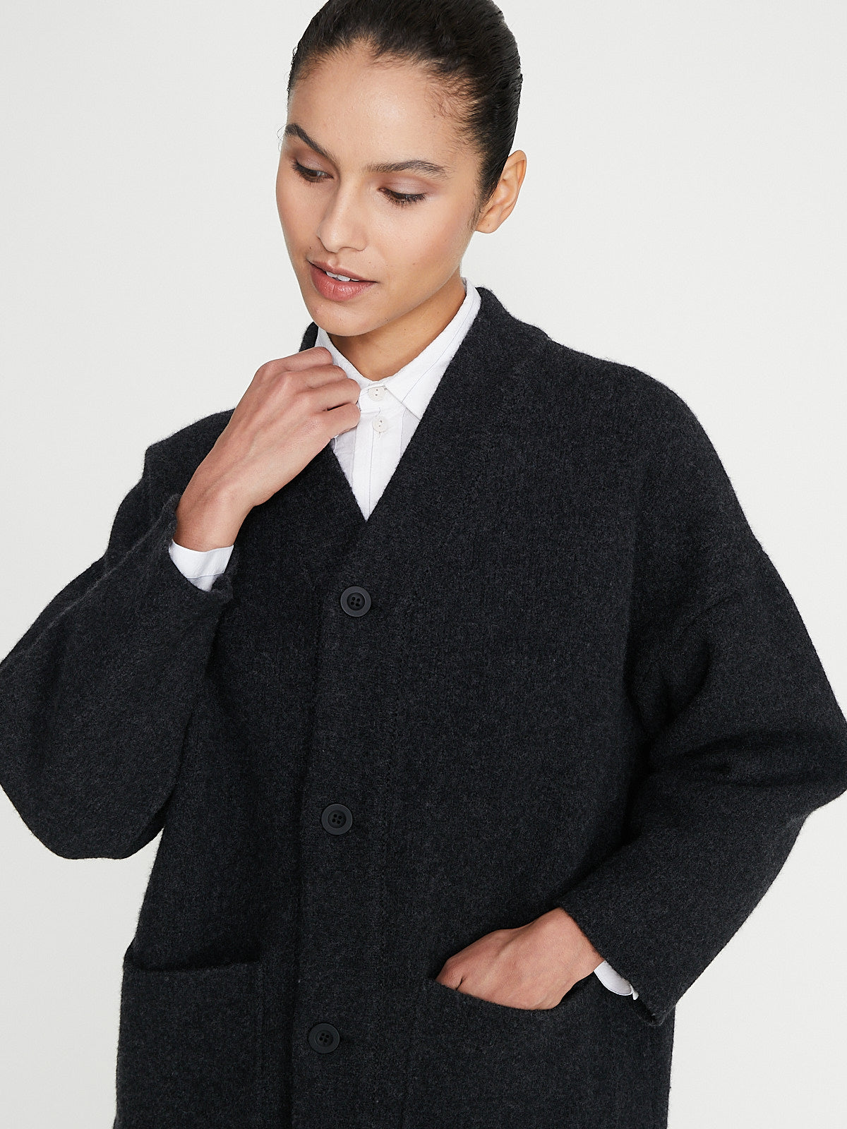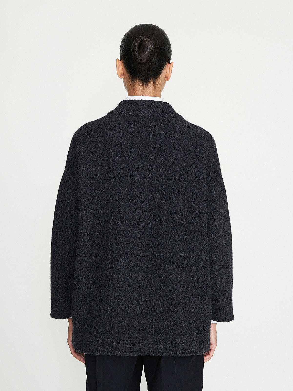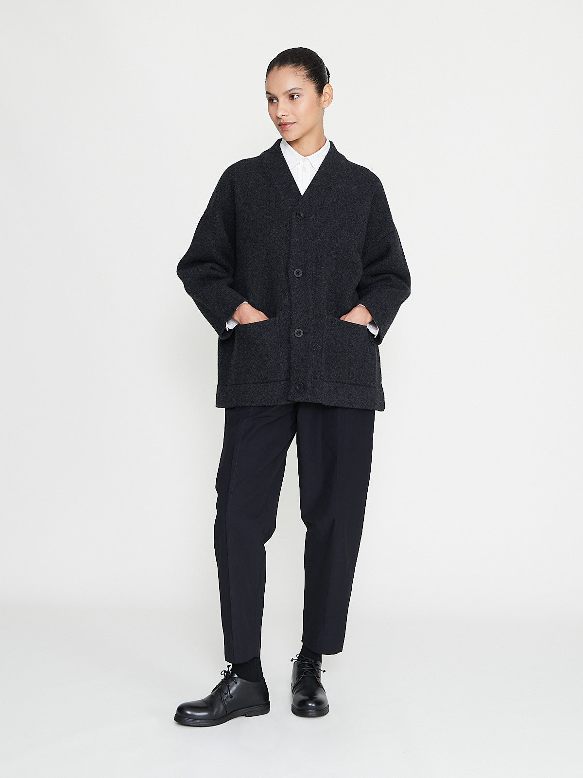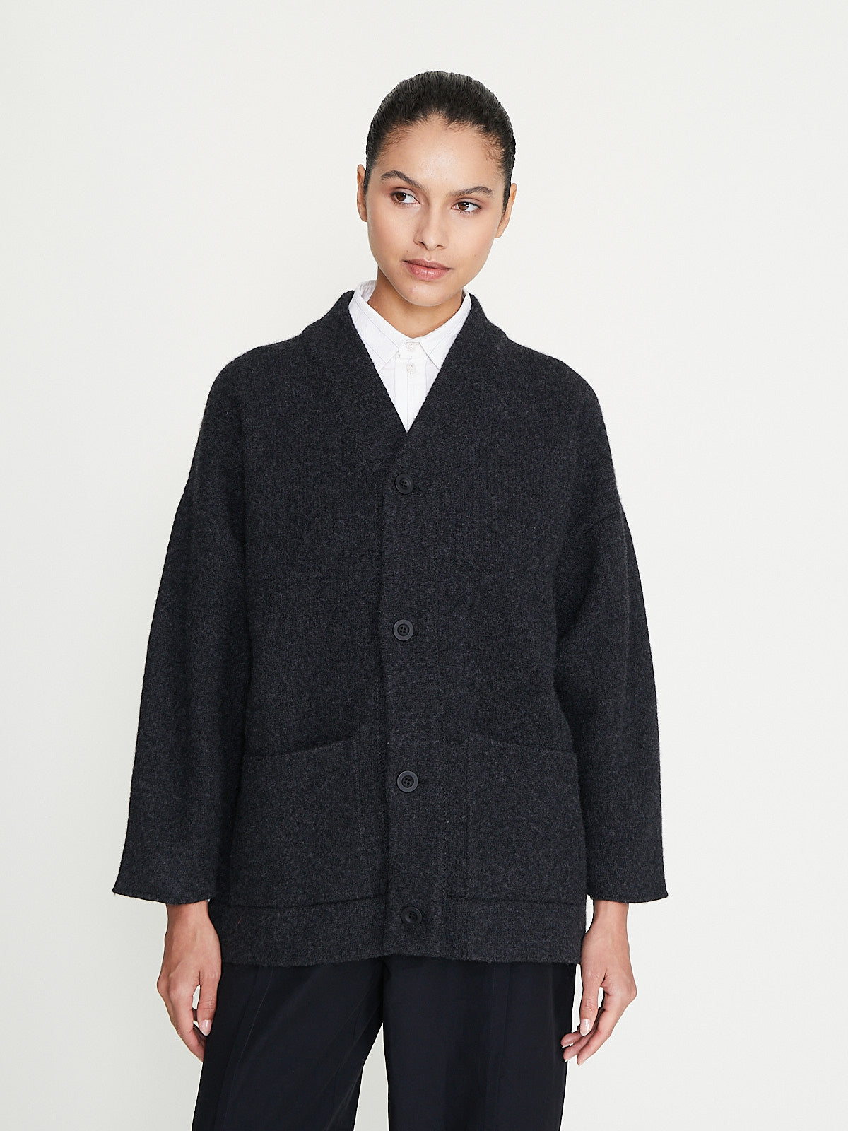 Oversized knitted cardigan knitted in Scotland using soft and densely felted dark grey lambswool from a heritage mill. V-neckline, long sleeves with a dropped shoulder and front sculptural horn button fastening. Deep patch pockets on the front. The seams are all externally linked to echo a woven raw cut felt detailing.