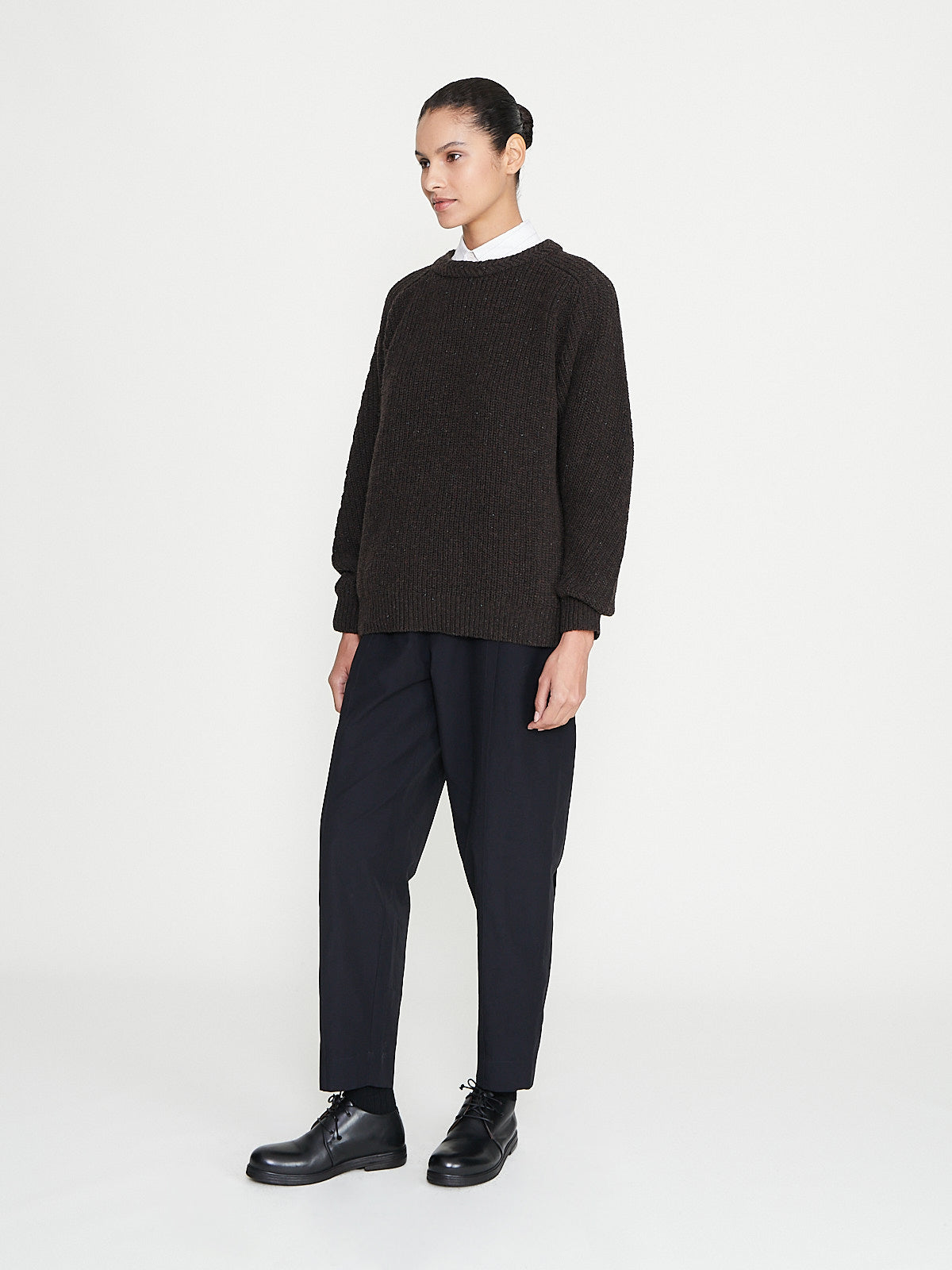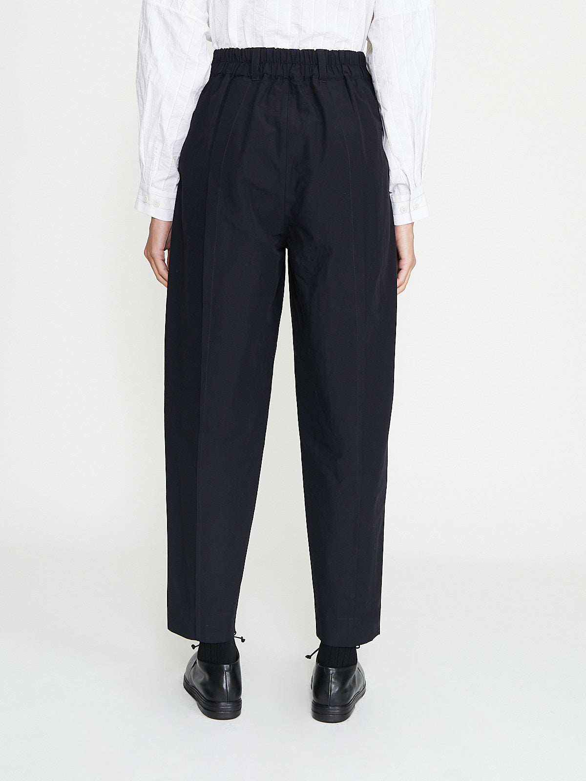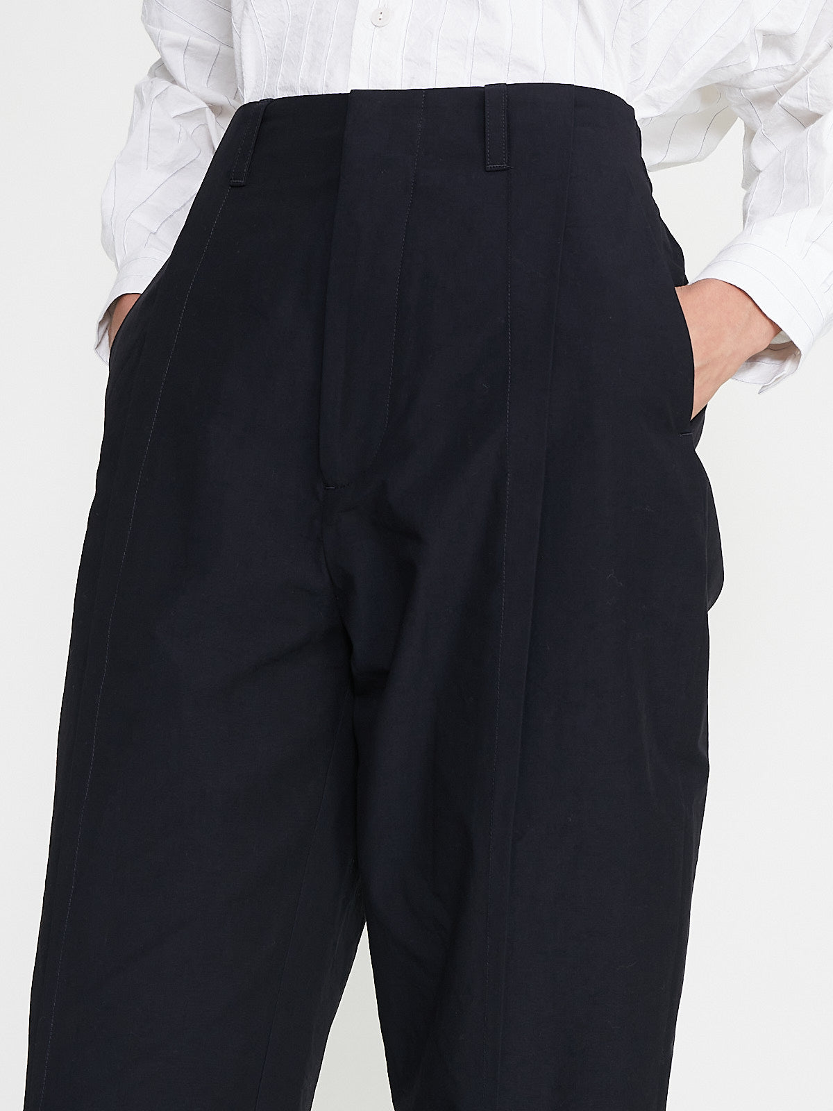 Voluminous trouser crafted in a sculptural Italian cotton, woven with a combination of ink and flint yarns for a rich depth of colour. Half elasticated and half tailored at the waist. Generous darts from the waistline continue down the front and back of the trouser to a pin tuck. Legs taper at the ankles.