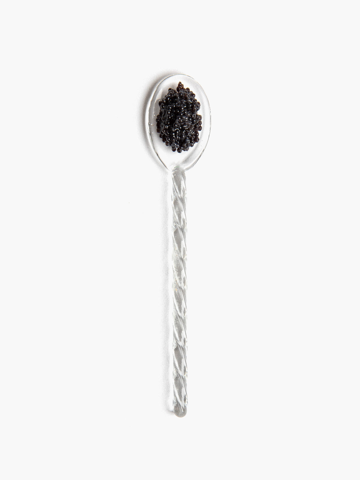 Set of 2 handmade small spoons made from clear Murano glass rods. This glass has been pulled and twisted by hand and then fused with the head using the lampworking techinque. Can be used for gelato and other soft desserts, or as small serving spoons for sugar, honey or preserves. Handcrafted by artisans in Murano.