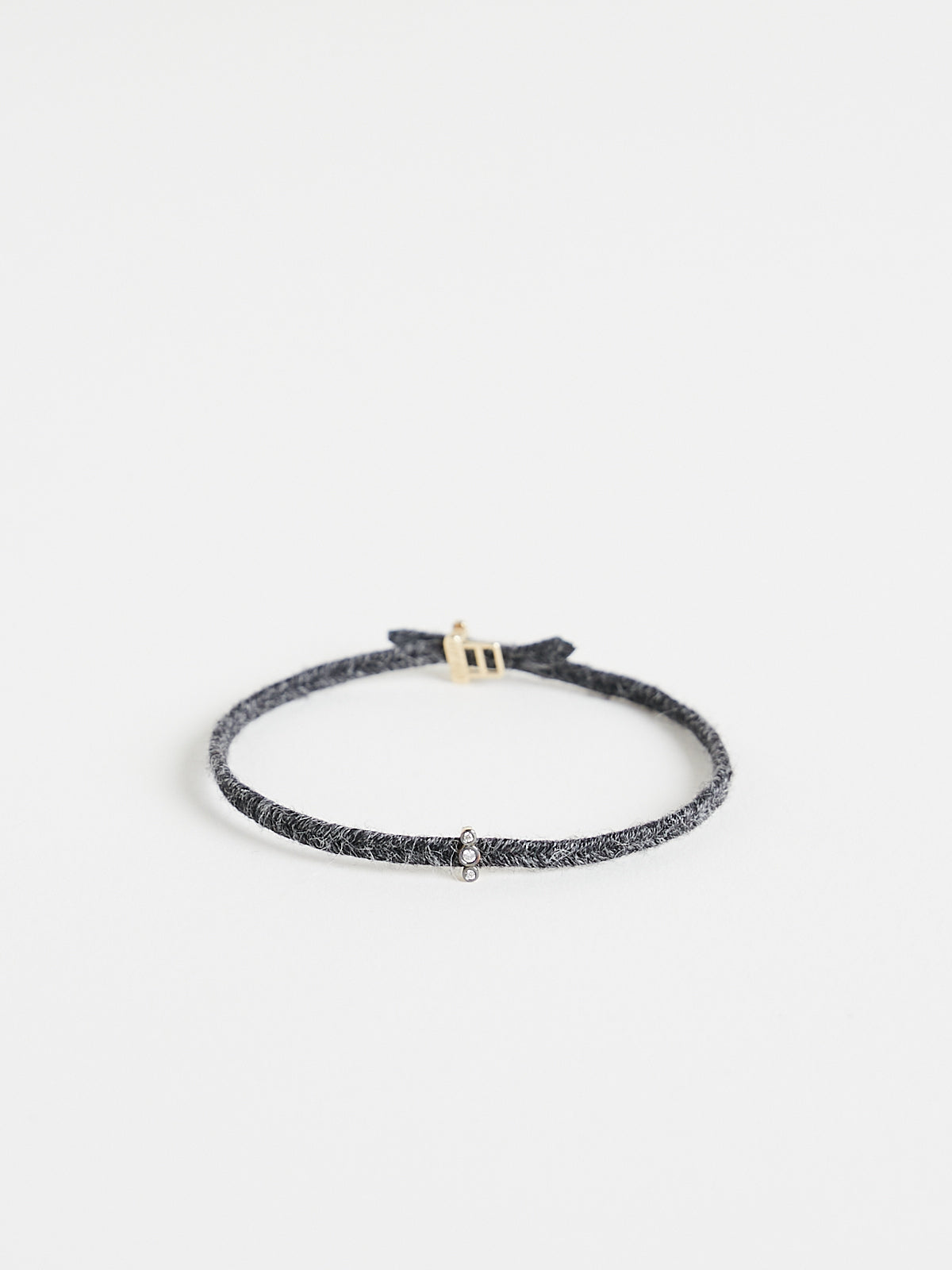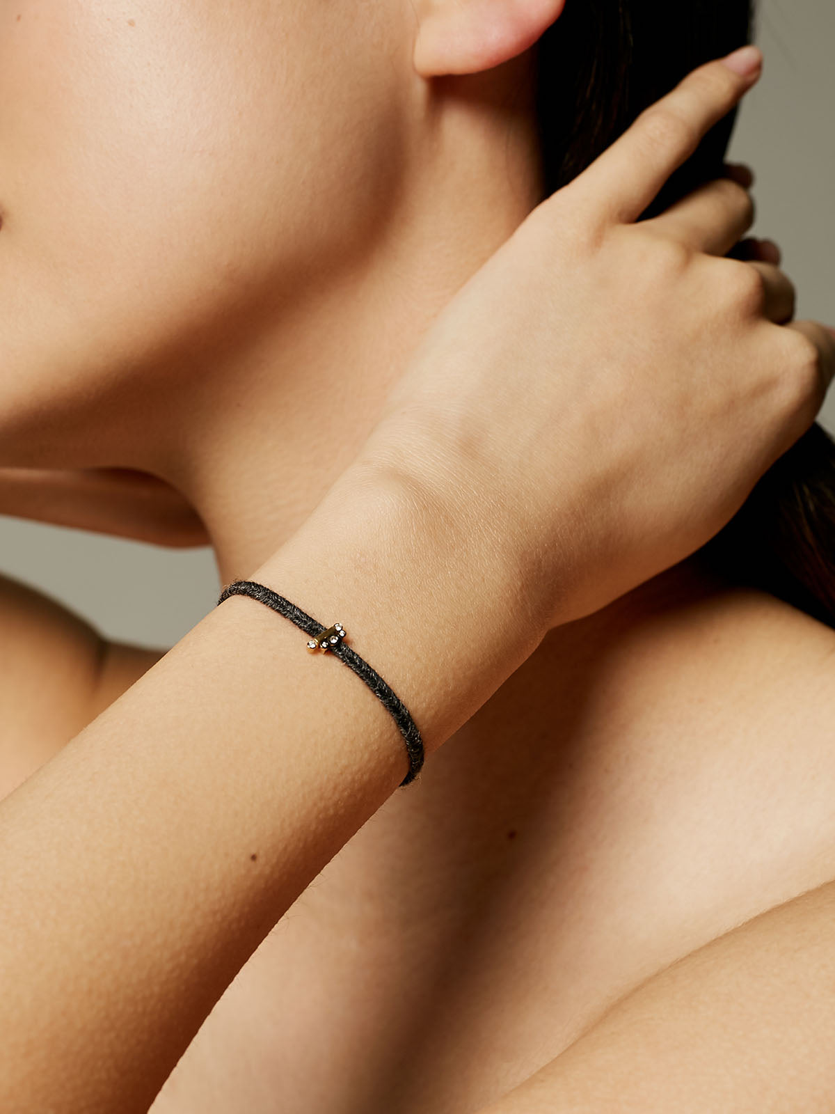 Cord bracelet with a handcrafted decorative element in 10k yellow gold encrusted with 0.02ct white diamonds surrounded with black rhodium. Features a 10k yellow gold clasp fastening. Please choose your cord colour in the drop-down menu.